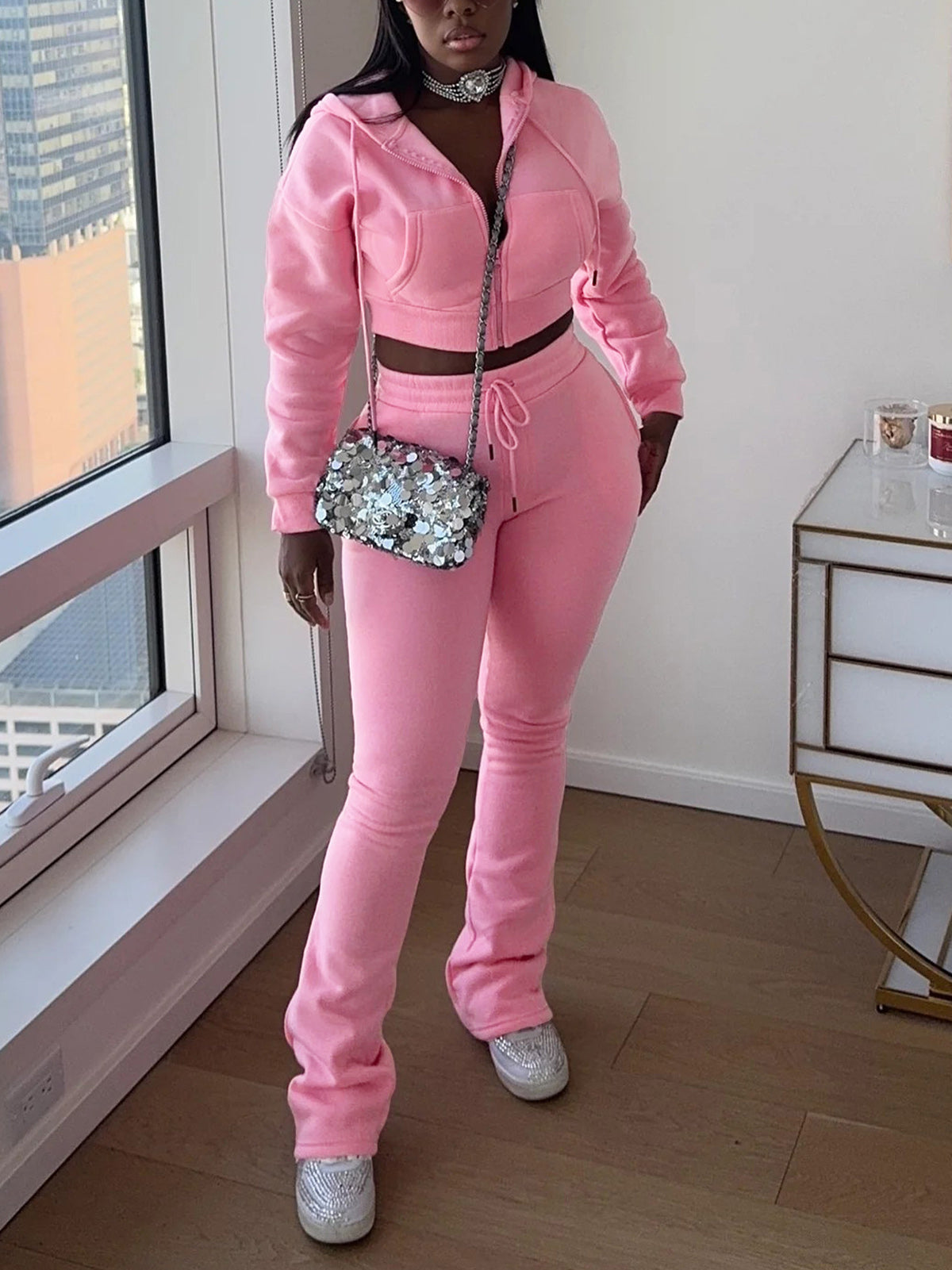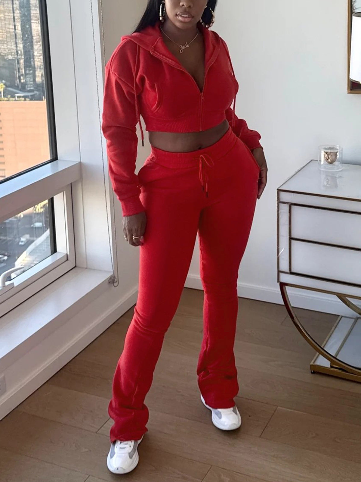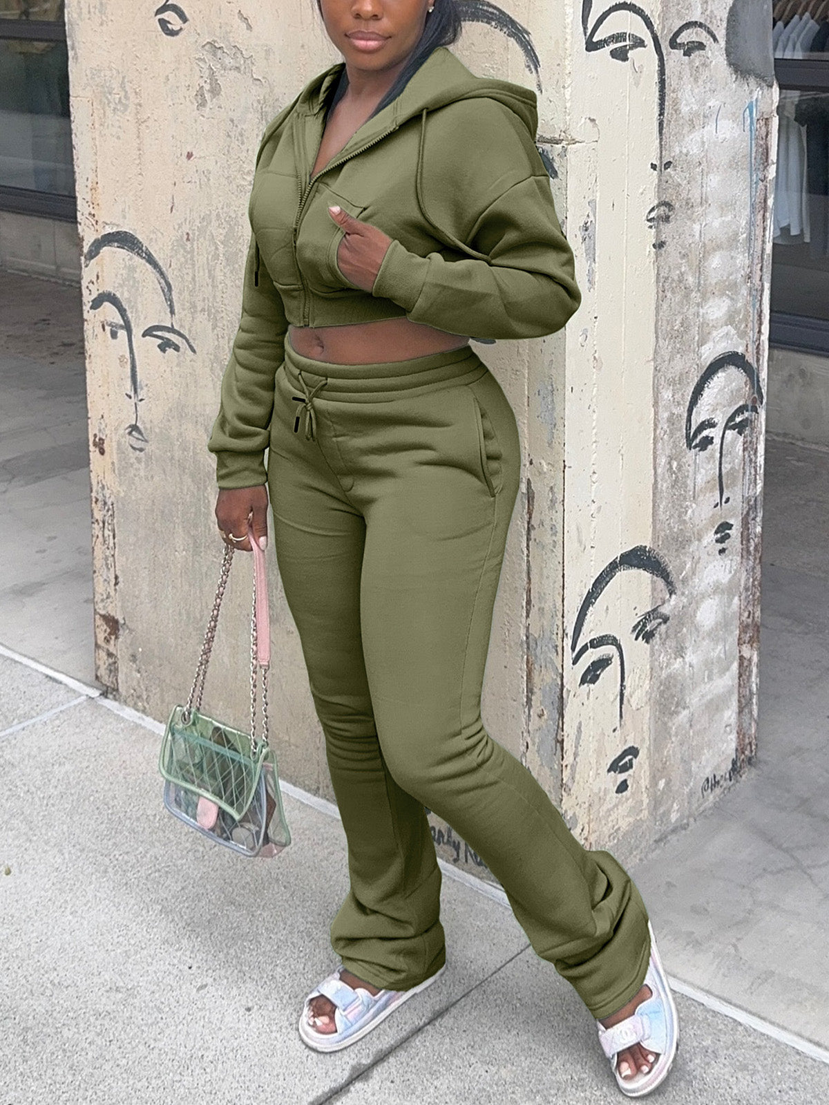 Casual Zipper Crop Hoodie and Pants Sports Sets