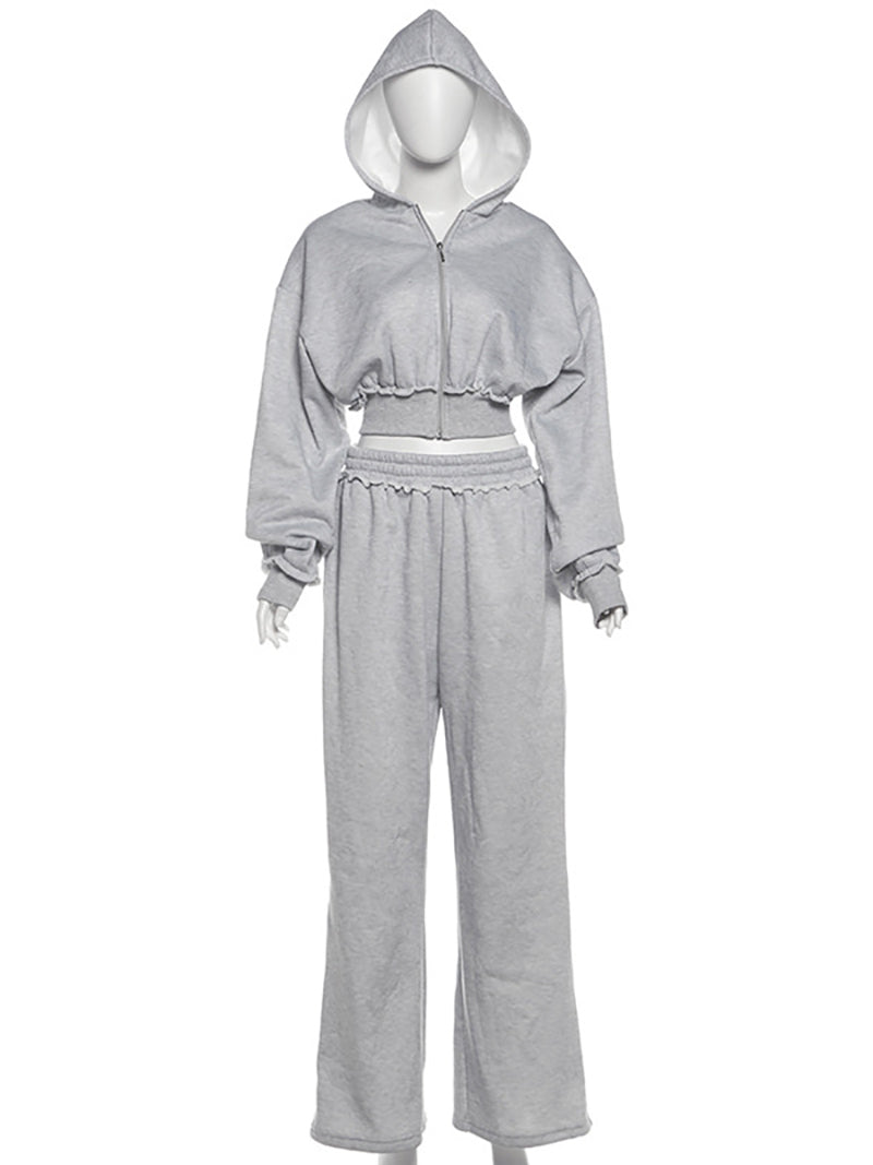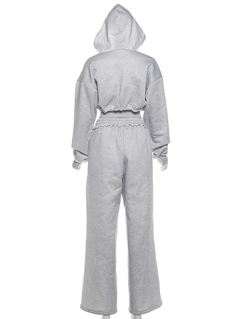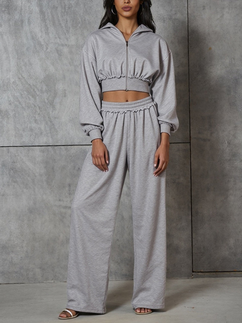 # Cropped Hooded Sweatshirt Wide Leg Pant Tracksuit Set This two-piece tracksuit combines contemporary style with comfort for wholesale buyers seeking versatile inventory. The cropped hooded sweatshirt features a relaxed fit with functional drawstrings, while the coordinating wide-leg pants offer a modern silhouette that flatters various body types. Perfect for casual wear, athleisure collections, or layering options. The matching set appeals to trend-conscious consumers and provides retailers with a complete outfit solution. Quality construction ensures durability through repeated wear and washing, making it an excellent value proposition for bulk orders.