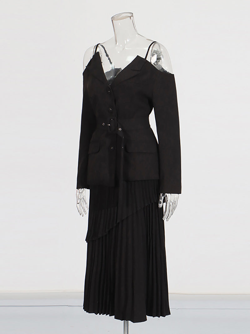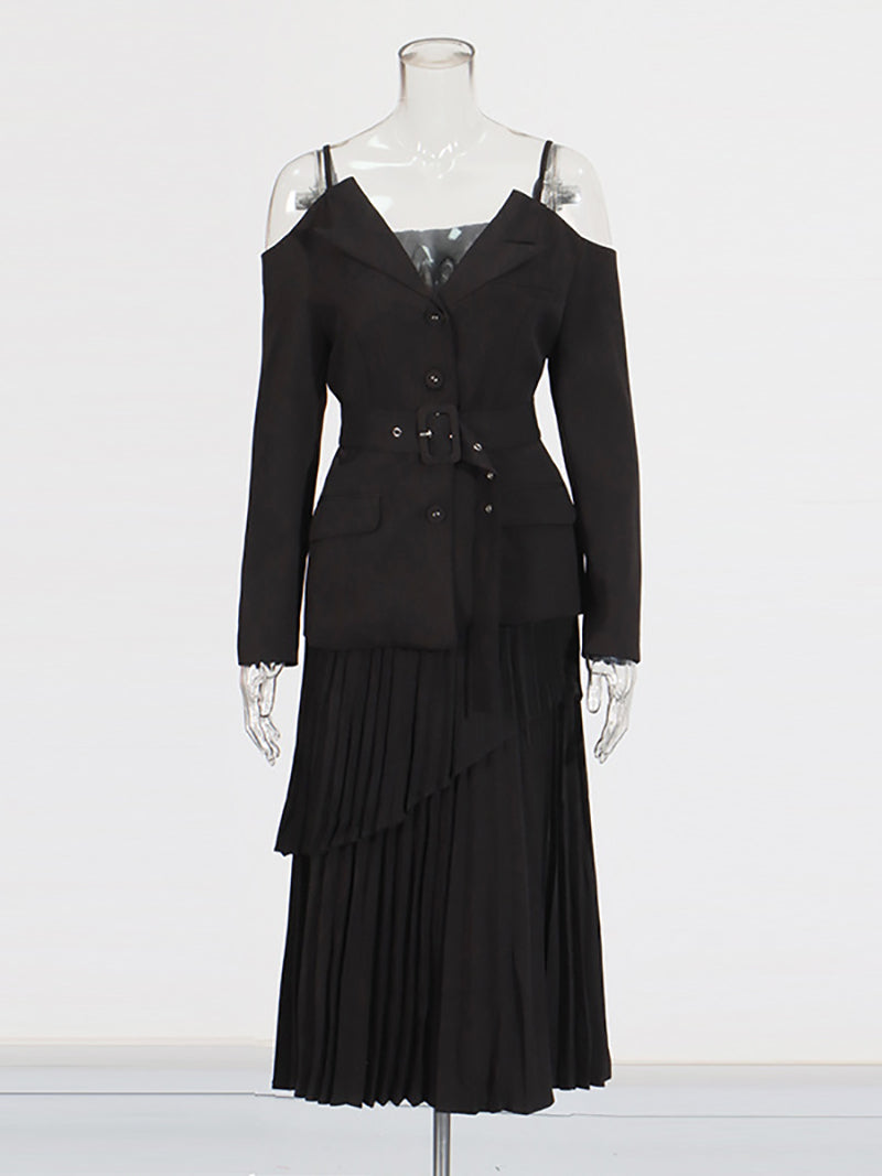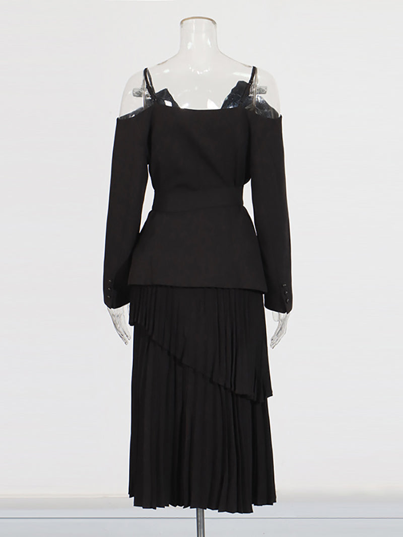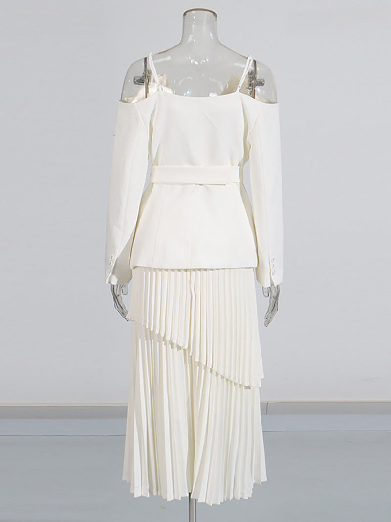 Elegant Off-shoulder Blazer and Pleated Skirt Set