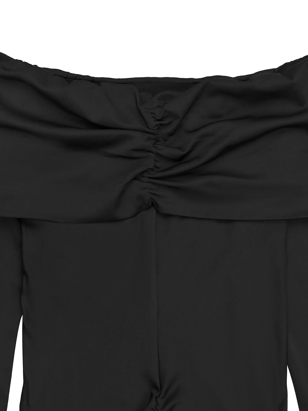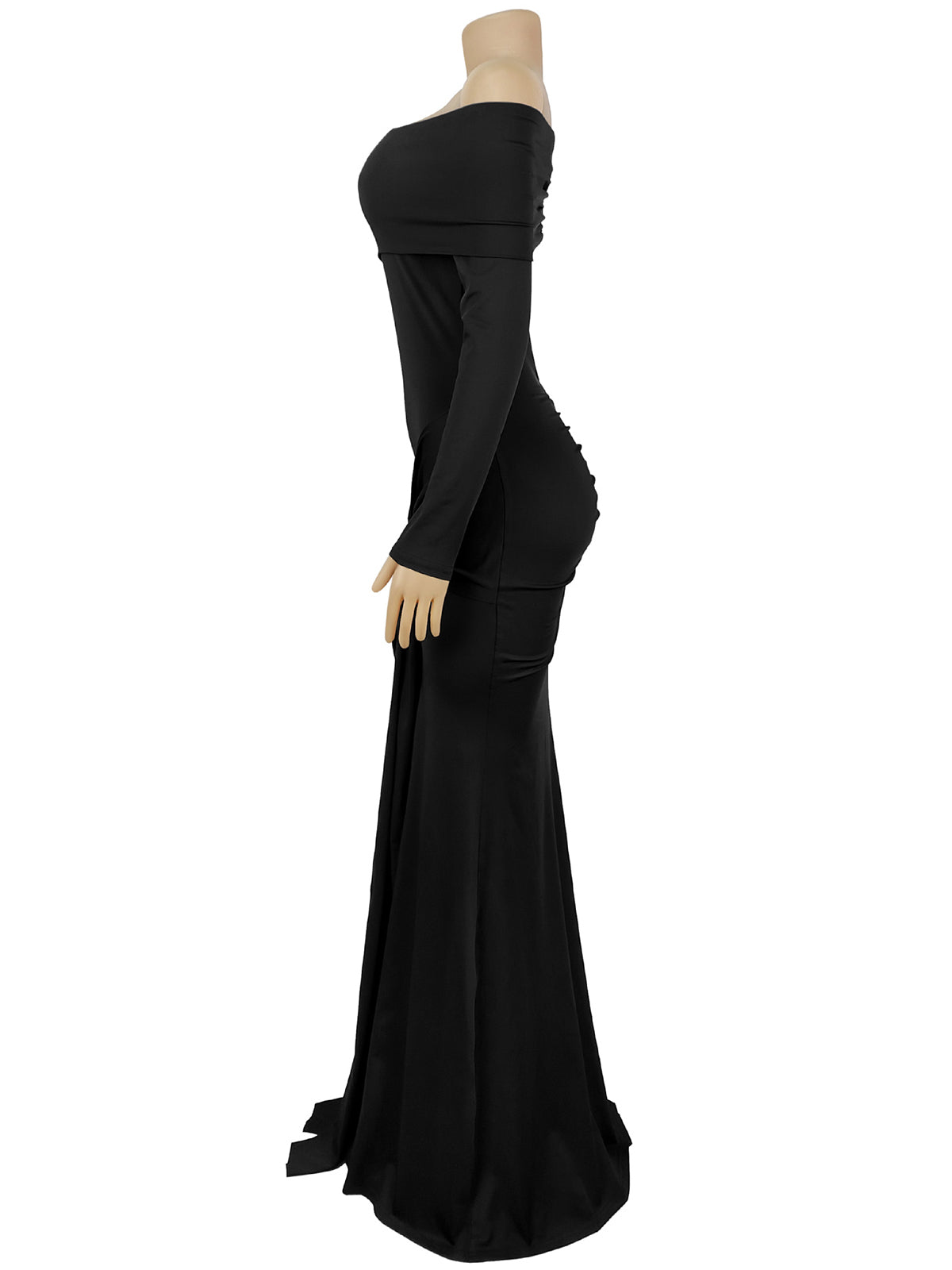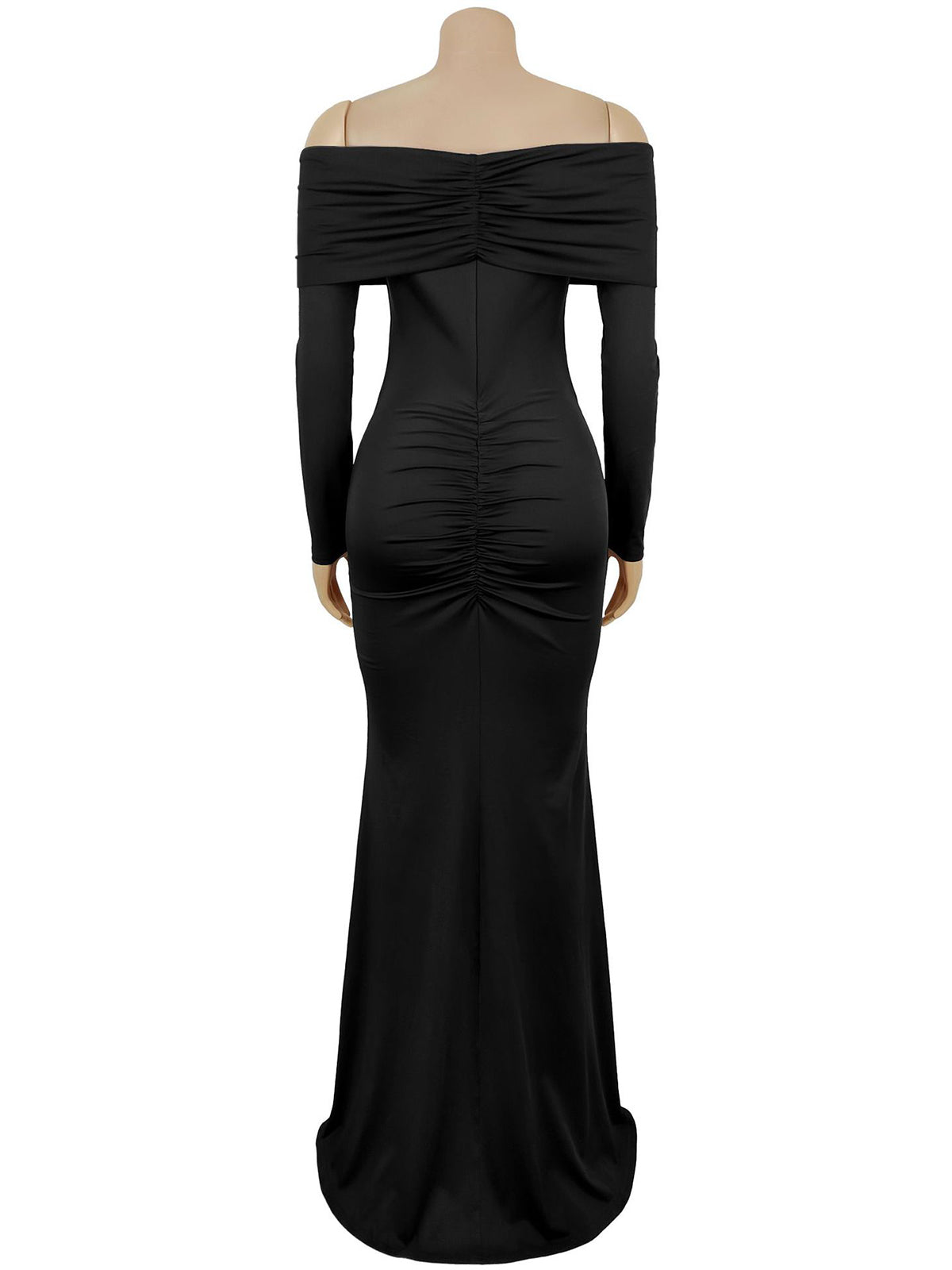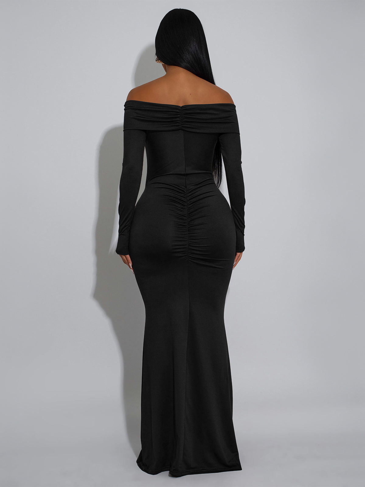 Sophisticated off-shoulder design with graceful long sleeves and flowing draped fabric creates an elegant silhouette. This maxi dress combines timeless style with modern appeal, perfect for evening events, formal occasions, or upscale casual wear. The draped detailing adds movement and dimension while the off-shoulder neckline offers a flattering, contemporary look. Crafted for comfort and versatility, this piece works beautifully for wholesale buyers seeking quality basics that appeal to fashion-forward customers. Ideal for boutiques and retailers looking to stock versatile, statement-making pieces.