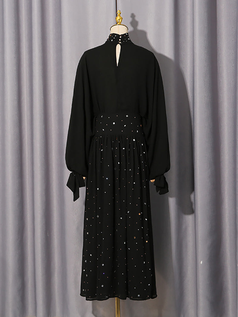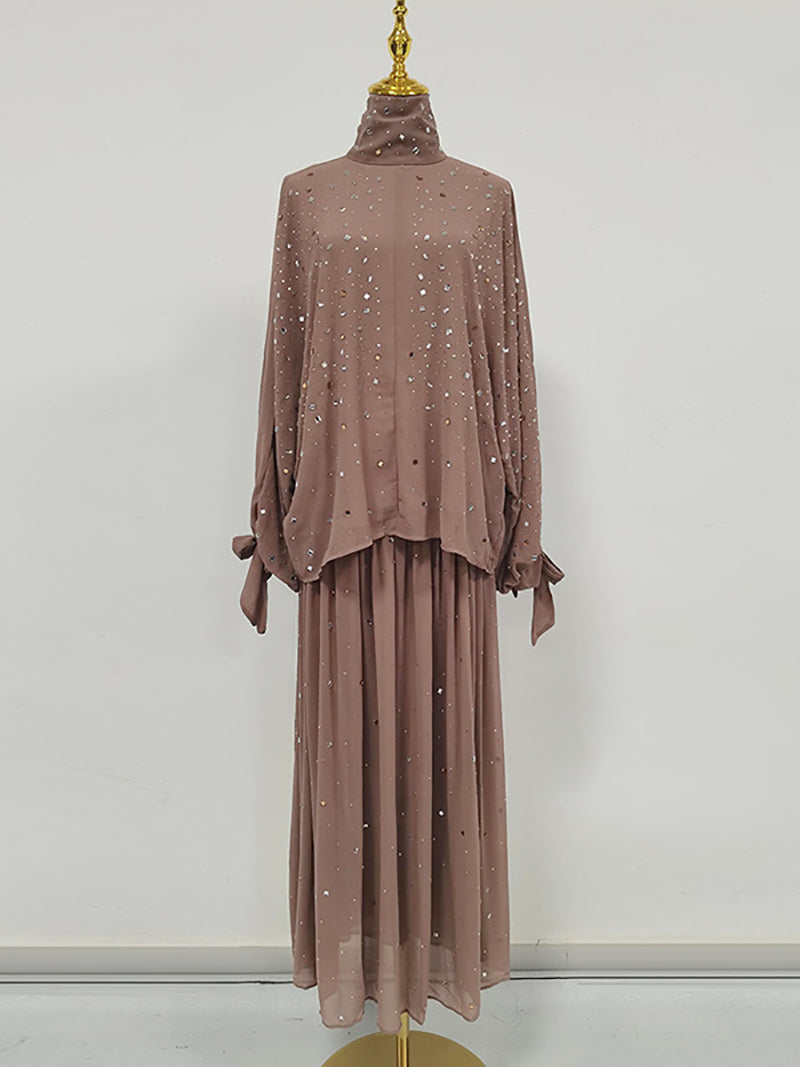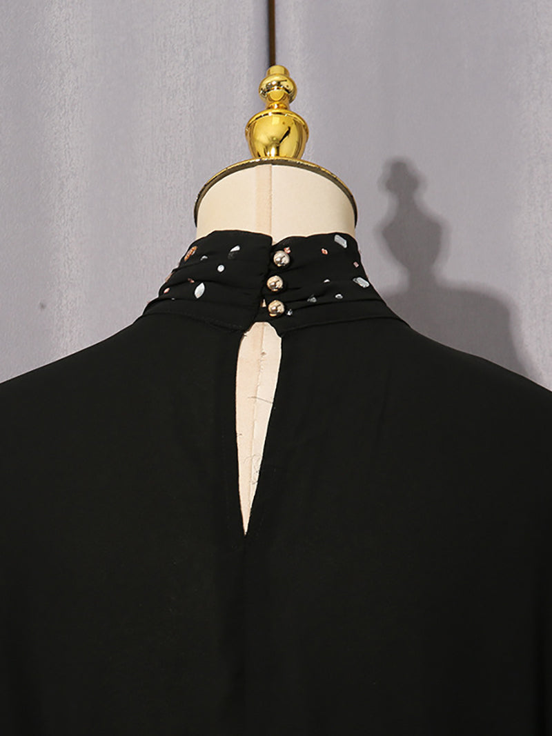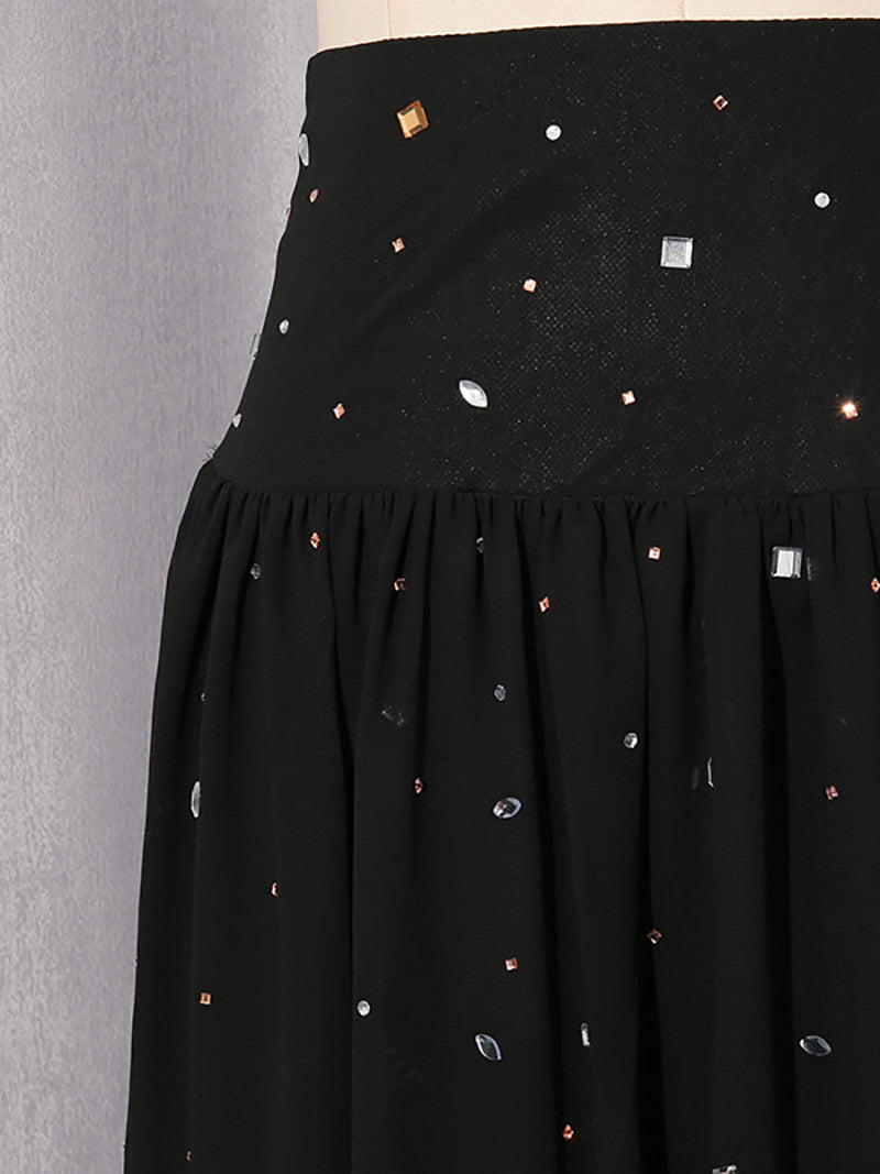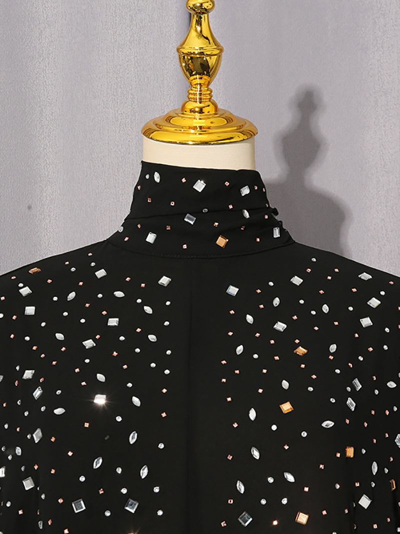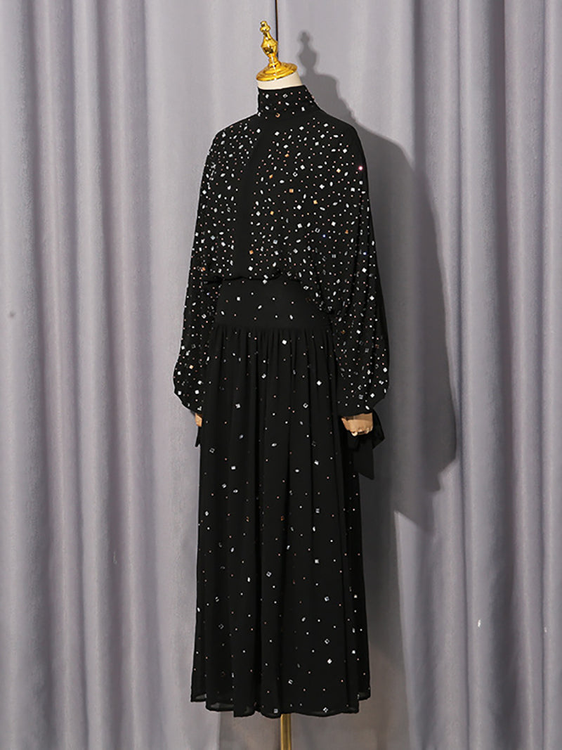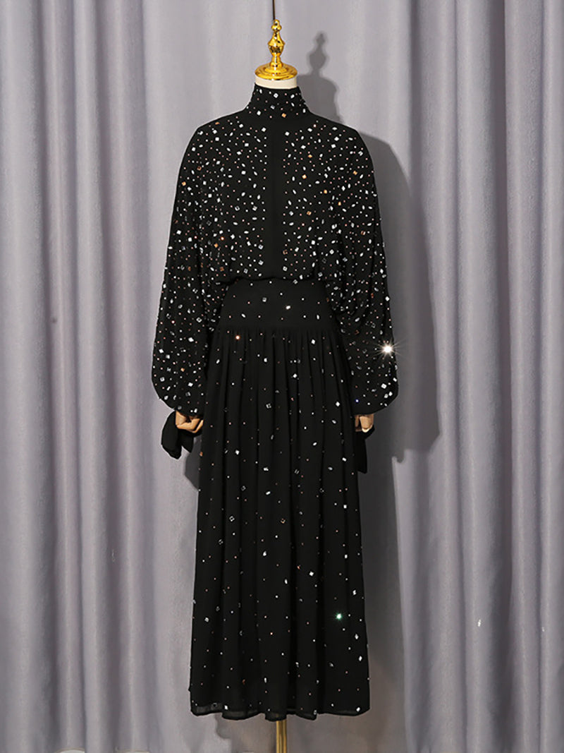 Elegant Stand Neck Rhinestone Top High Waist Skirt Sets
