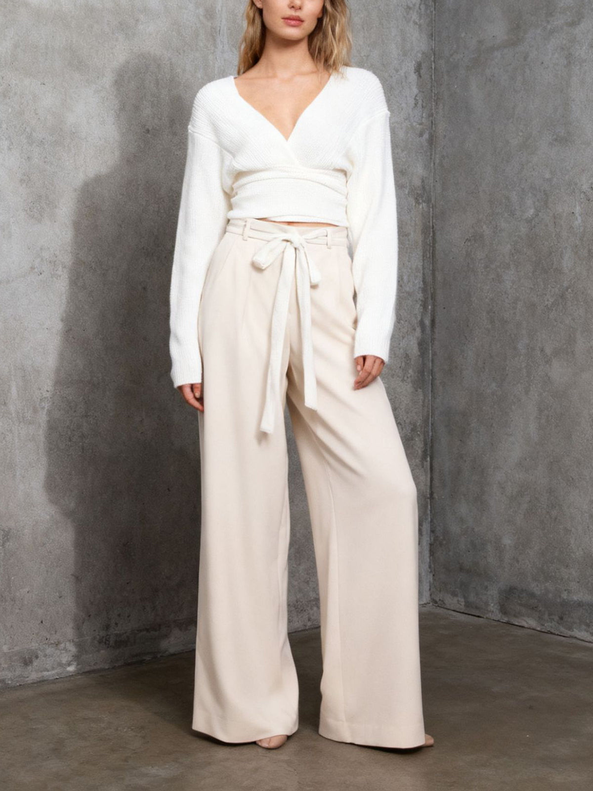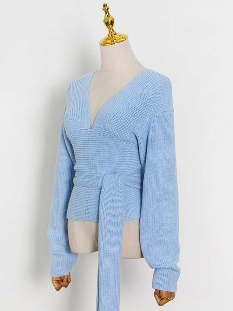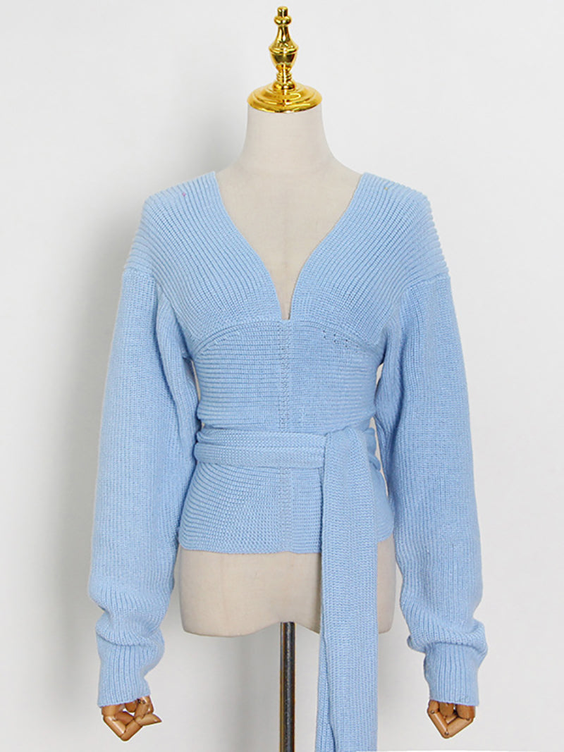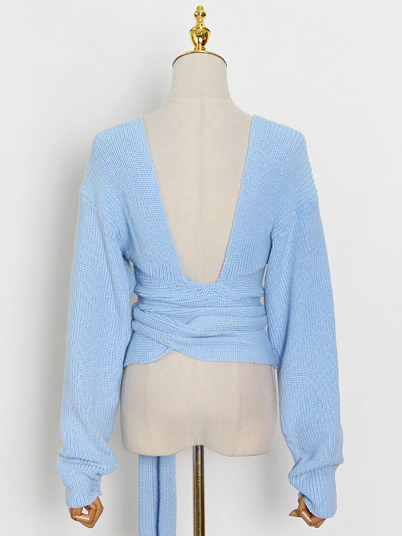 Sophisticated V-neck backless sweatshirt featuring a cinched waist design for a flattering silhouette. The open back detail adds contemporary appeal while the fitted waist creates definition. Crafted for comfort and style, this piece transitions seamlessly from casual to elevated looks. Perfect for wholesale buyers seeking versatile basics with modern design elements that resonate with fashion-forward customers.
