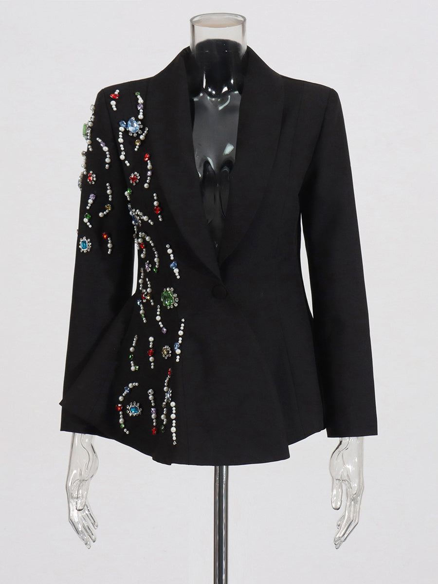 Wholesale supplier: Enhance your customers' professional wardrobes with our Fashion Bead-embellished Peplum Irregular Slim Blazer. This blazer features elegant water diamond embellishments that add a touch of sophistication to any outfit. Upgrade their blazer game with this stylish and versatile piece.