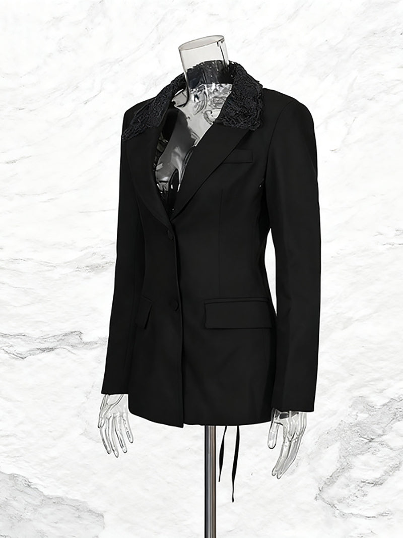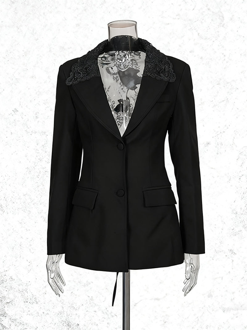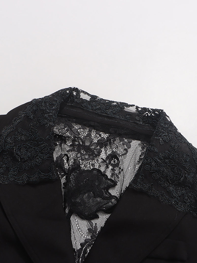 # Fashion Hollow Out Lace Patchwork Slim Blazer Elevate your wardrobe with this sophisticated slim blazer featuring intricate hollow-out lace patchwork details. The modern design combines tailored structure with delicate lace accents, creating a versatile piece perfect for both professional and casual settings. The fitted silhouette flatters the figure while the lace elements add visual interest and texture. Ideal for layering or wearing as a standalone statement piece, this blazer transitions seamlessly from office to evening wear. A timeless investment for discerning retailers seeking quality pieces with contemporary appeal.