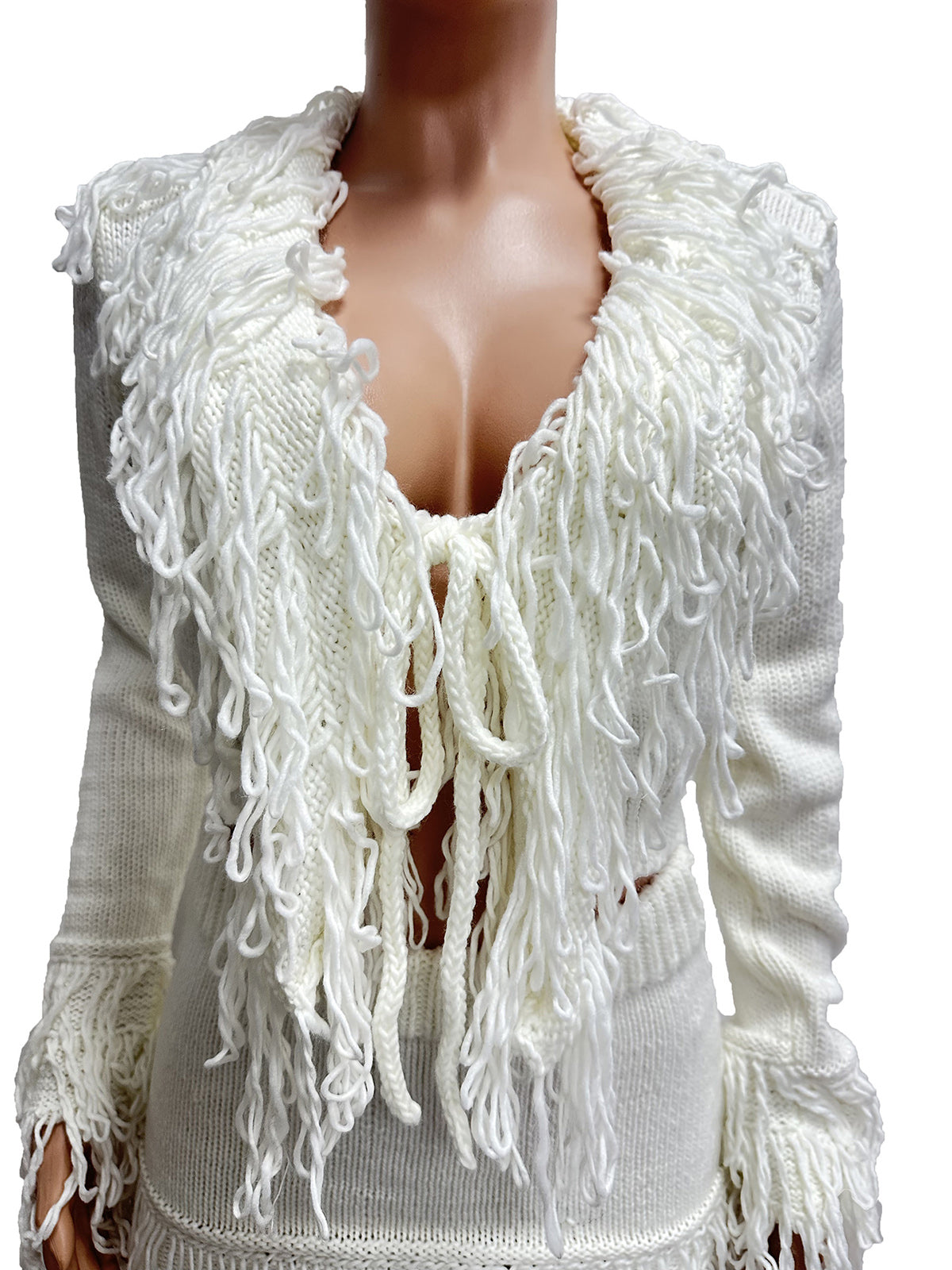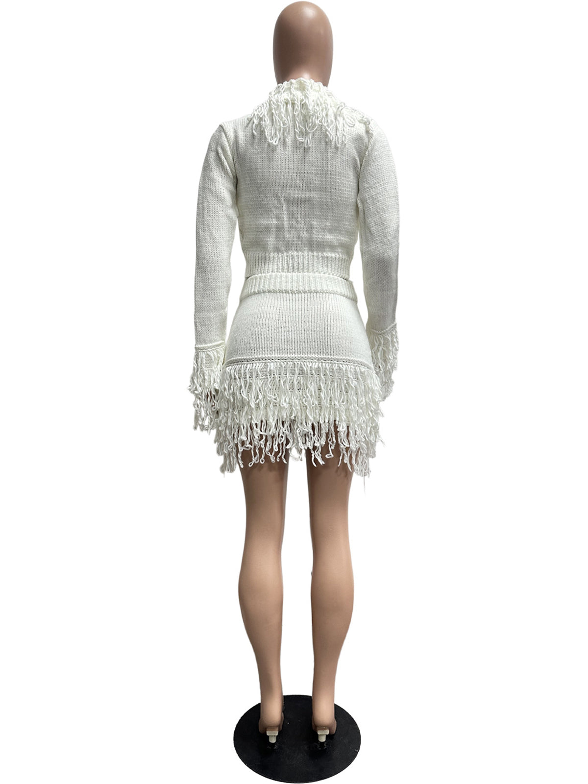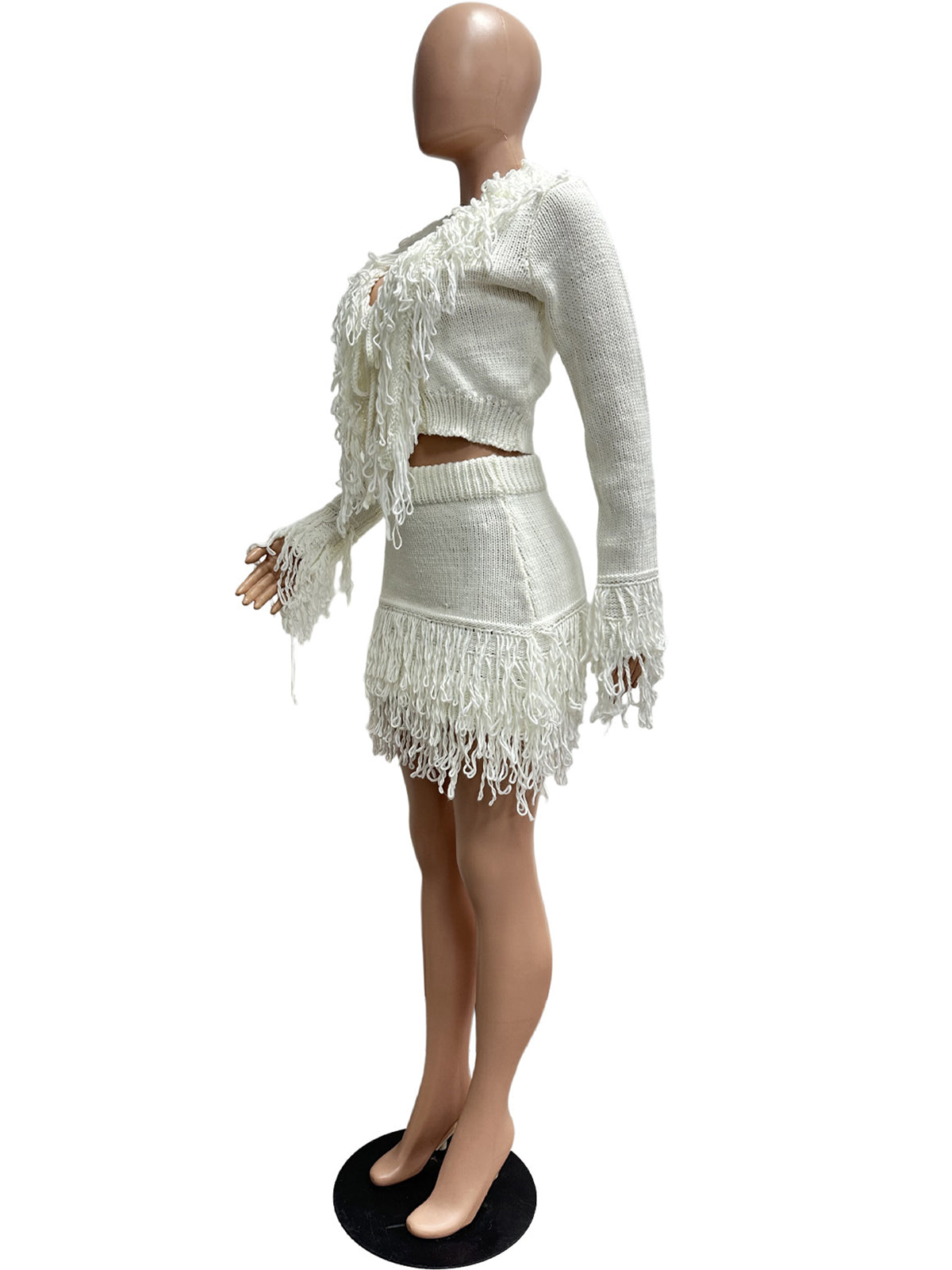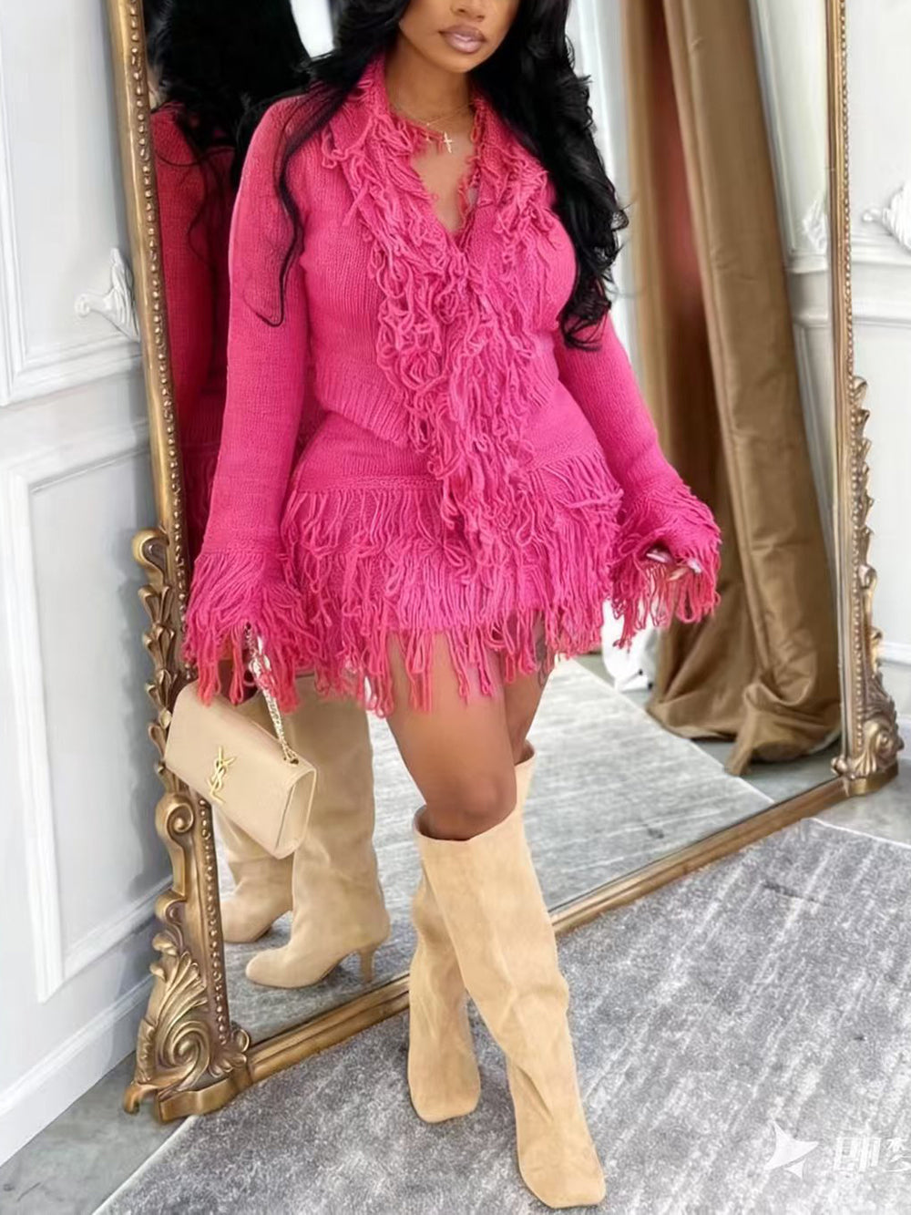 # Fashion Knit Cardigan And Fringe Skirt Set Elevate your wholesale inventory with this versatile two-piece ensemble. The soft knit cardigan features a classic silhouette perfect for layering, while the coordinating fringe skirt adds contemporary flair. This set offers excellent value for retailers seeking trendy, mix-and-match pieces that appeal to fashion-forward customers. Quality construction ensures durability through multiple seasons, making it an ideal choice for bulk orders and resale.