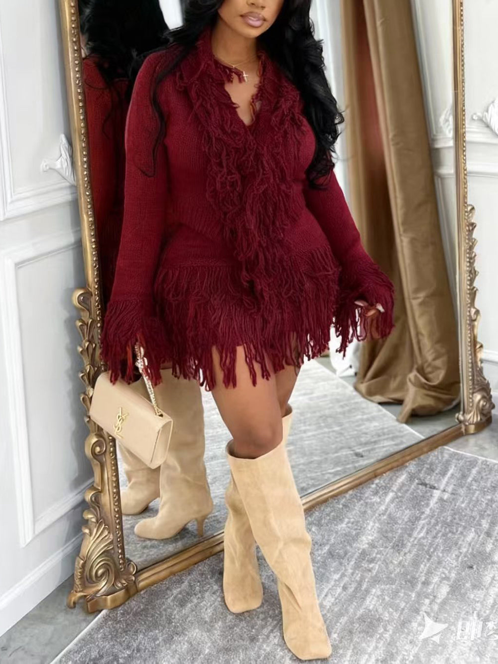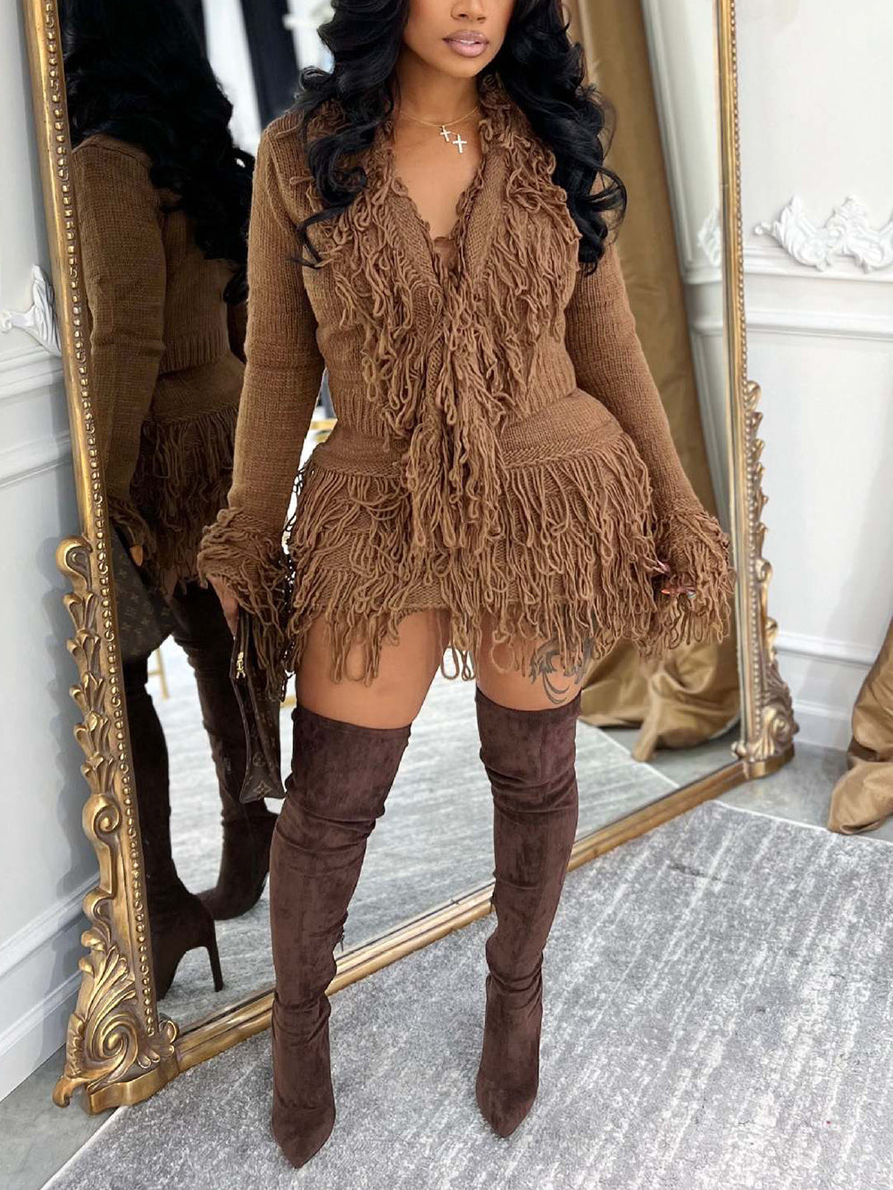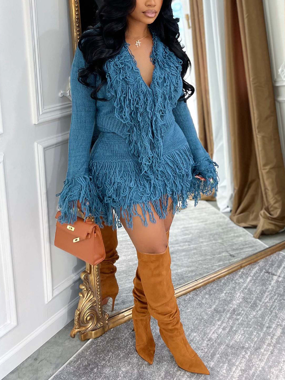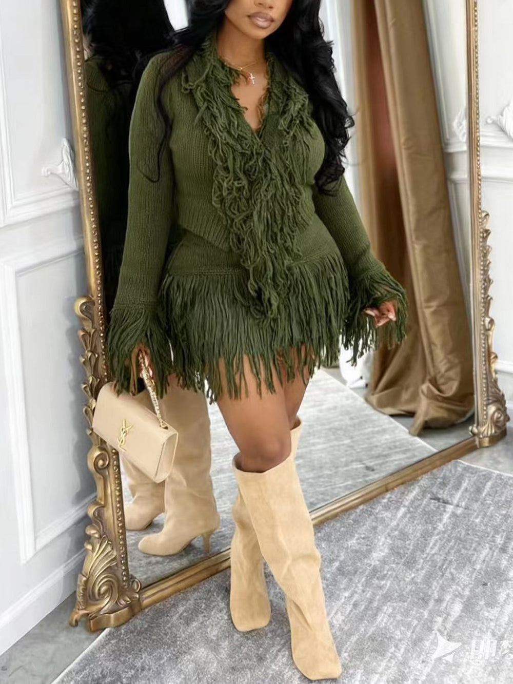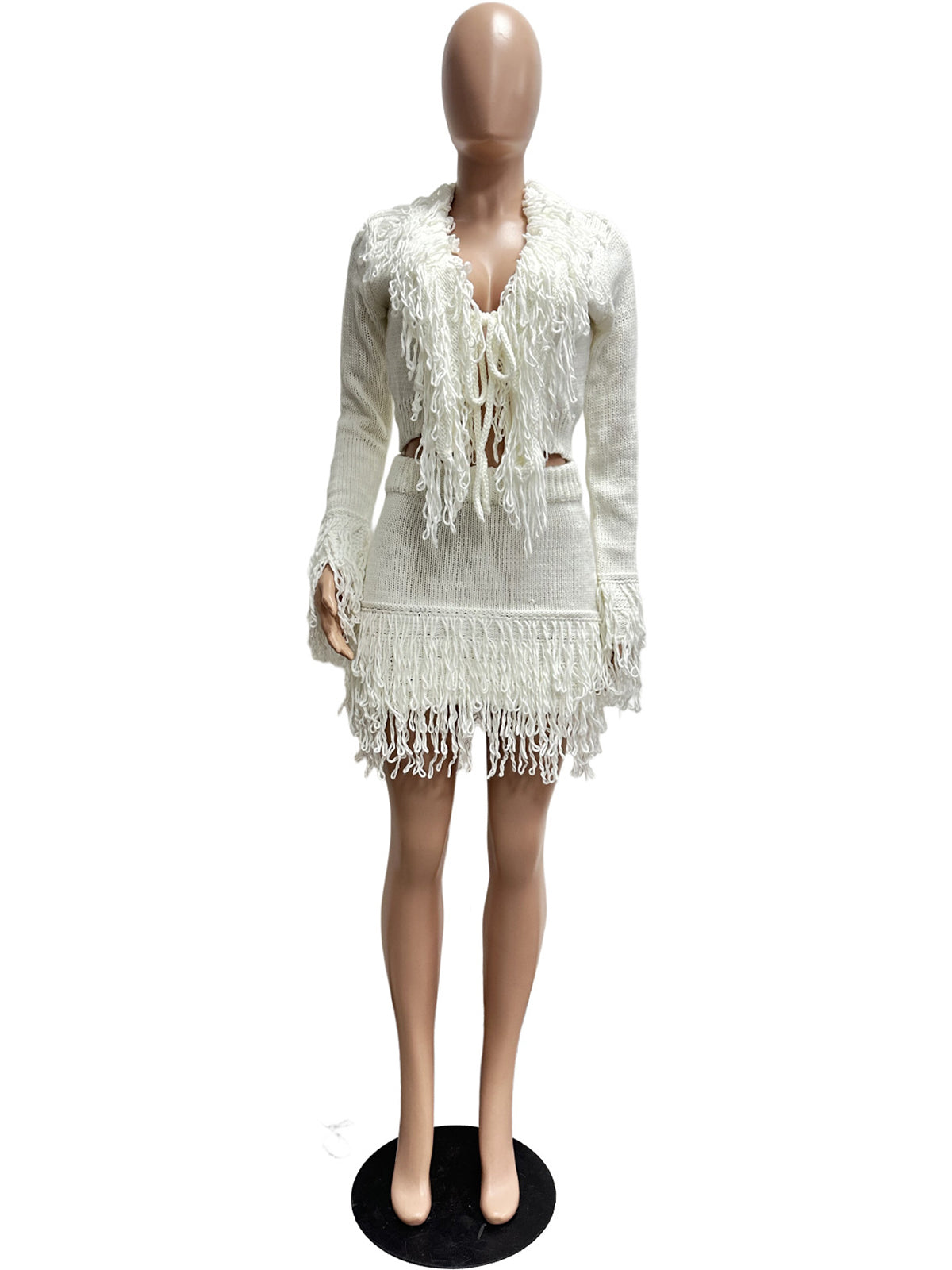 # Fashion Knit Cardigan And Fringe Skirt Set Elevate your wholesale inventory with this versatile two-piece ensemble. The soft knit cardigan features a classic silhouette perfect for layering, while the coordinating fringe skirt adds contemporary flair. This set offers excellent value for retailers seeking trendy, mix-and-match pieces that appeal to fashion-forward customers. Quality construction ensures durability through multiple seasons, making it an ideal choice for bulk orders and resale.