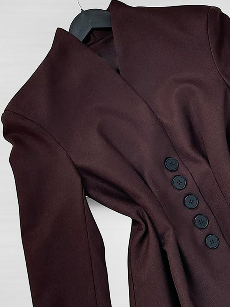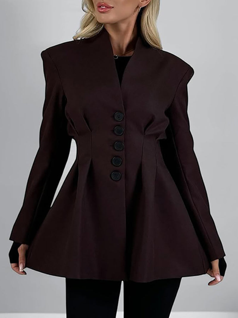 This fashion-forward single-breasted blazer features a cinched waist for a tailored, flattering fit. Its sleek design offers a polished look ideal for both professional and casual settings. Perfect for wholesalers seeking stylish, versatile outerwear that appeals to a wide range of customers.