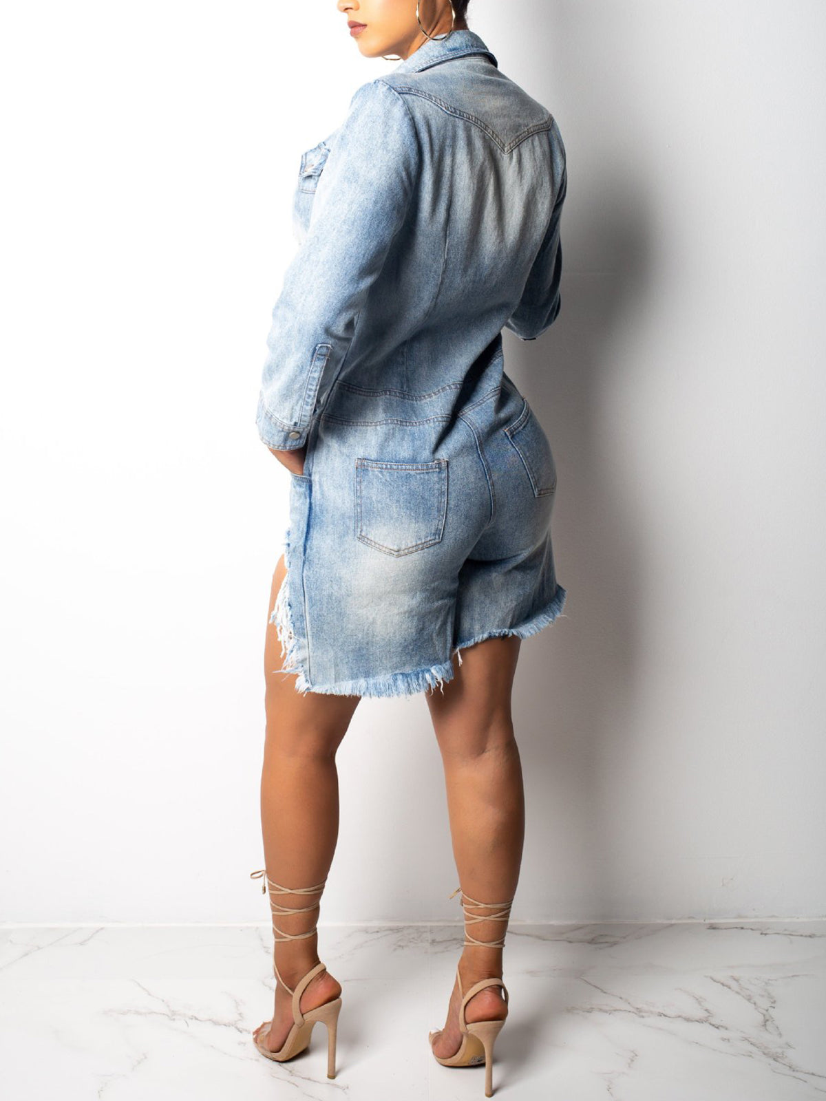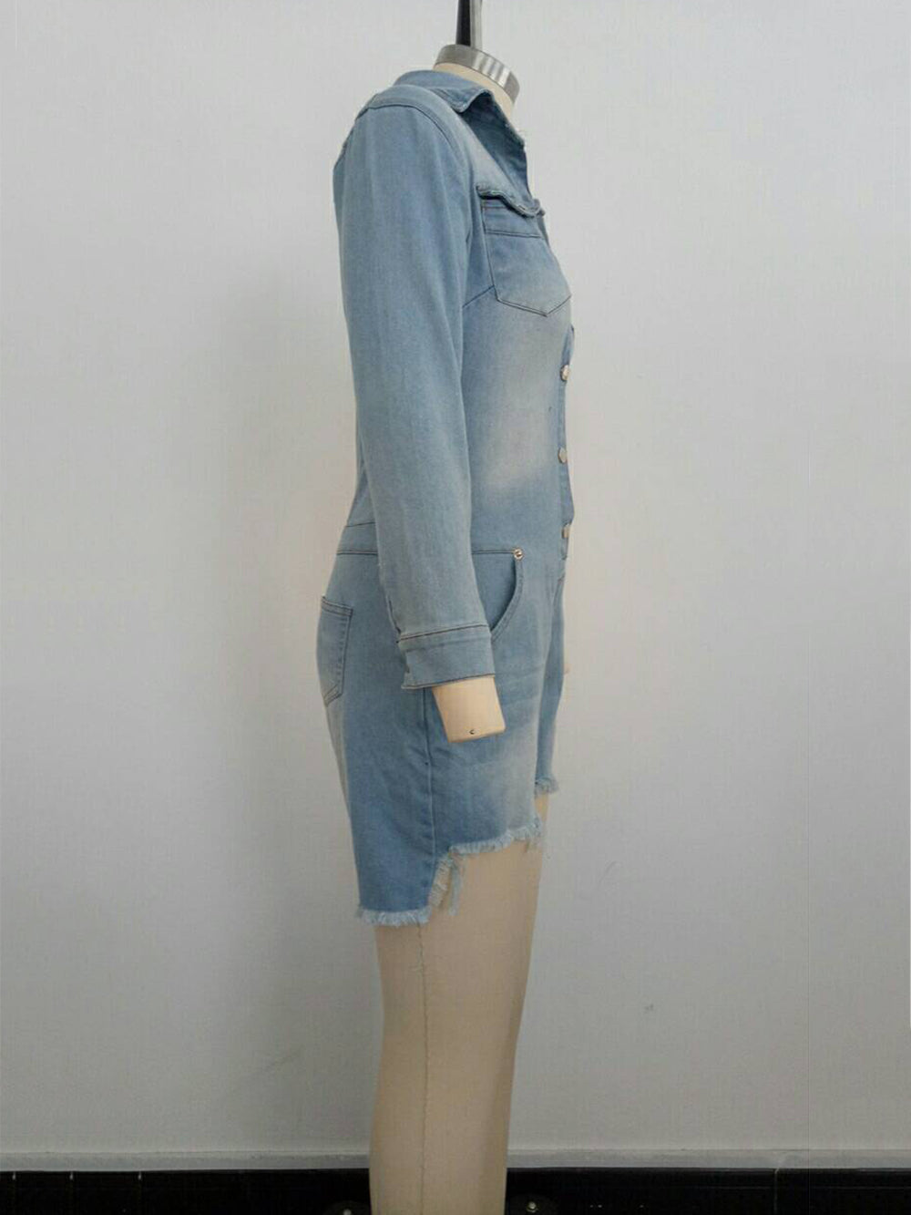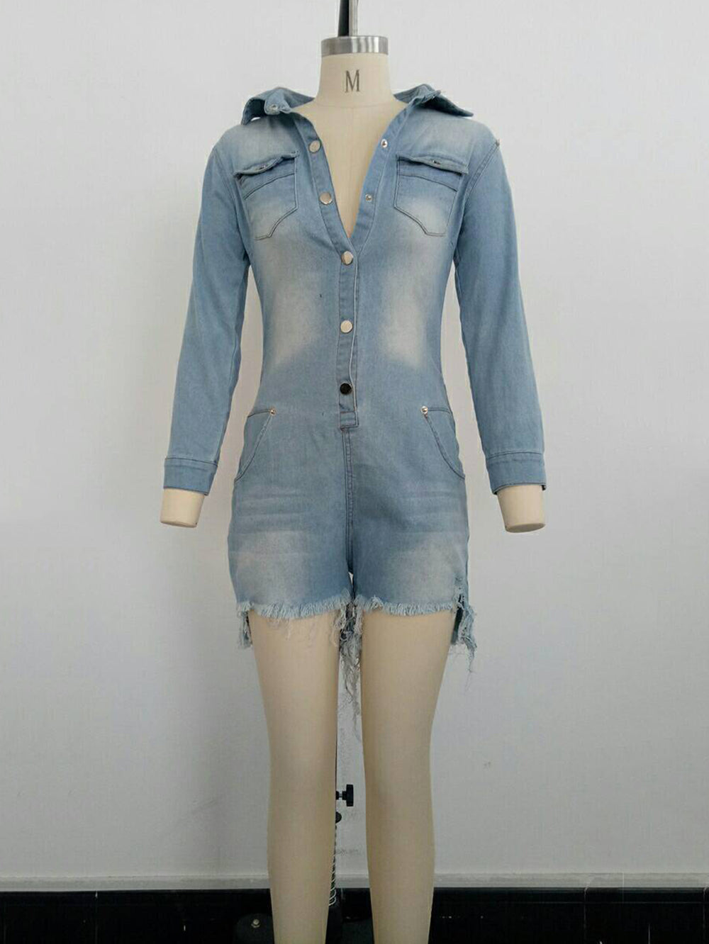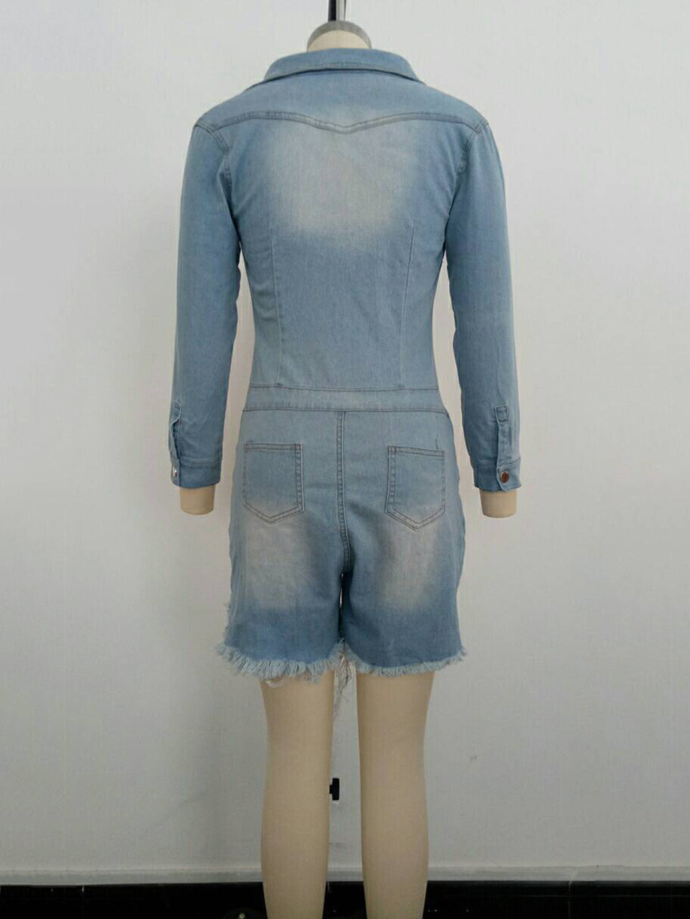 This Fashion Turn Down Collar Denim Romper combines style and comfort, featuring a classic turn-down collar and durable denim fabric. It's perfect for casual wear and offers easy movement, making it an ideal choice for wholesalers seeking trendy and versatile apparel.