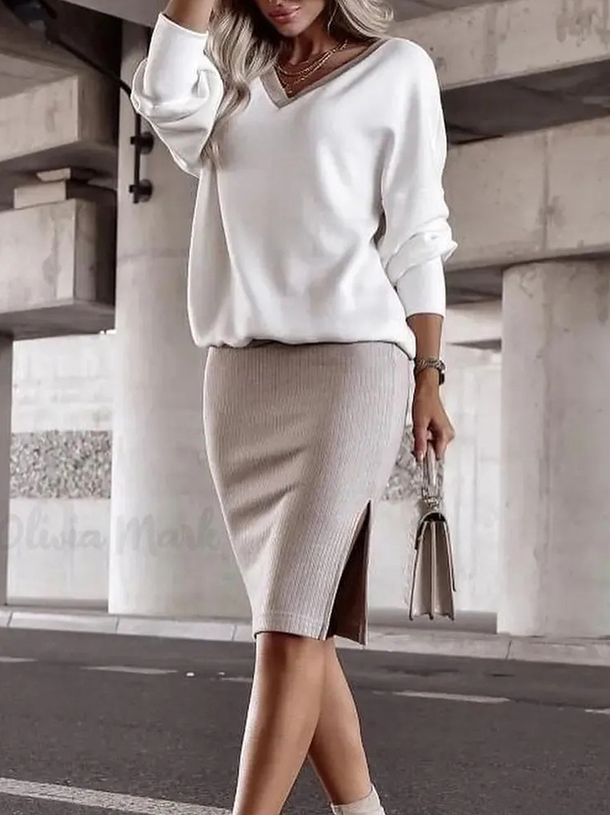 This fashionable set features a stylish V-neck top paired with a high-waist, knee-length skirt, creating a chic and coordinated look. Designed for comfort and elegance, it is ideal for various occasions. Perfect for wholesale buyers seeking trendy and versatile apparel to expand their inventory.