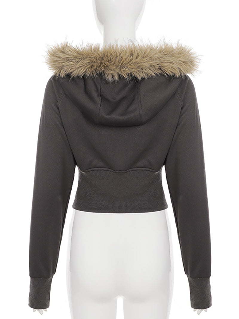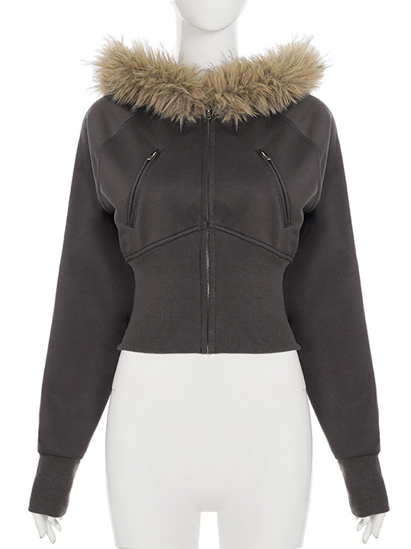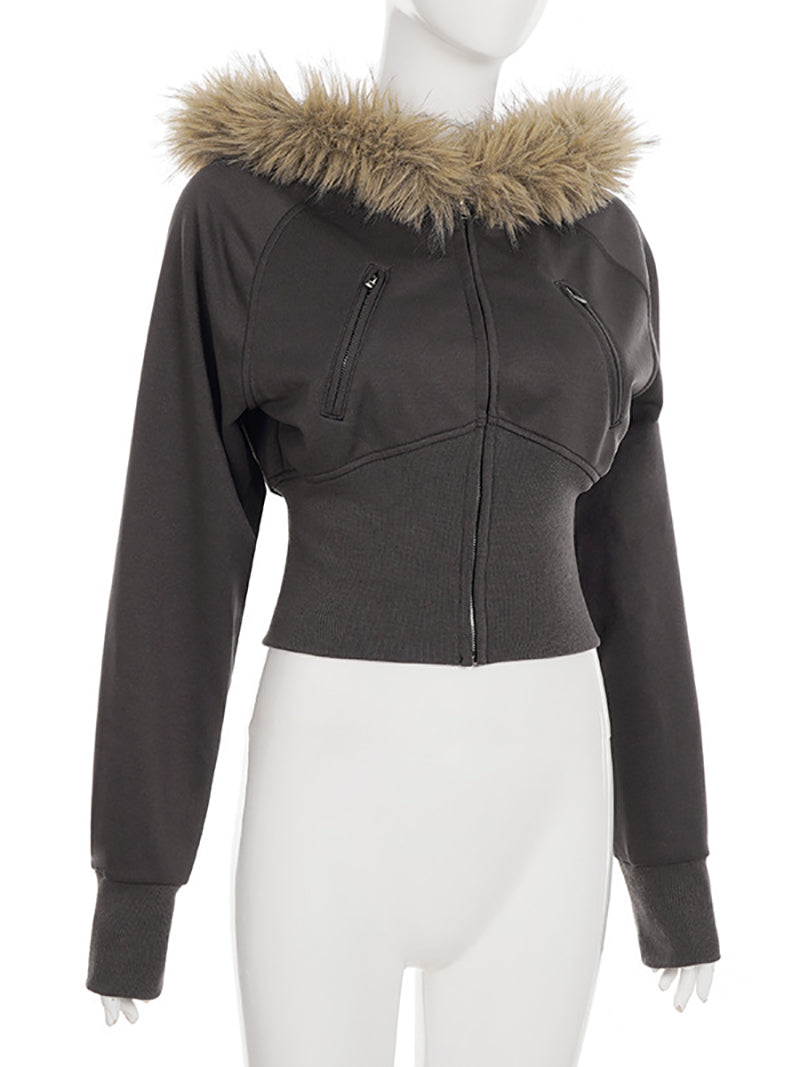 This fitted cropped jacket features a faux furry trim hood, combining warmth with a stylish edge. Its sleek design ensures a flattering fit while offering comfort, making it an attractive option for wholesale buyers seeking trendy outerwear.