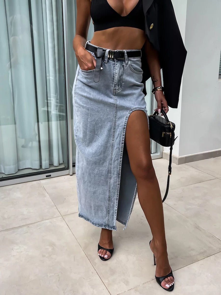 As a wholesaler, this High Waist Irregular Denim Midi Skirt offers great value with its high profit...