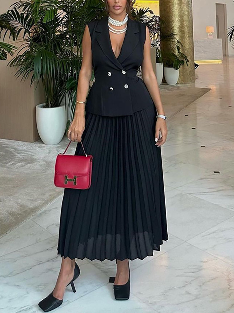 Excellent value for money with this Notched Collar Cinched Waist Blazer With Pleated Skirt set. This professional ensemble offers premium quality at a competitive wholesale price. Perfect for retailers looking to maximize profit margins while providing customers with stylish, versatile office and formal wear options.