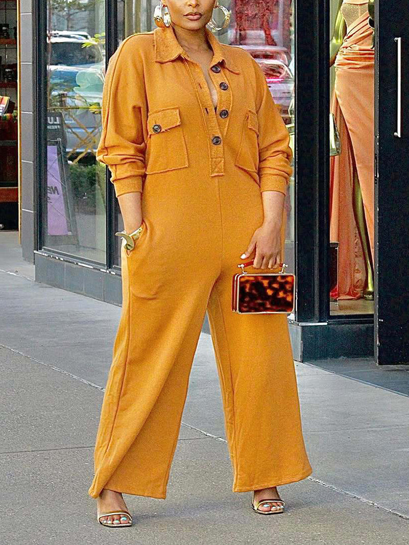 This plus size jumpsuit features a fashionable lapel design and wide-leg silhouette, offering comfort and style for all-day wear. Crafted to flatter diverse body shapes, it is an ideal choice for wholesale buyers seeking versatile and trendy apparel options. Its blend of elegant structure and relaxed fit makes it perfect for various occasions.