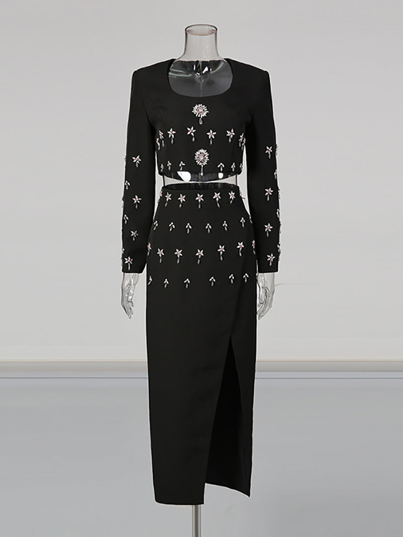 Discover exceptional value with our Rhinestone Embellished Cropped Top and Mini Skirt Sets. This stunning two-piece ensemble...
