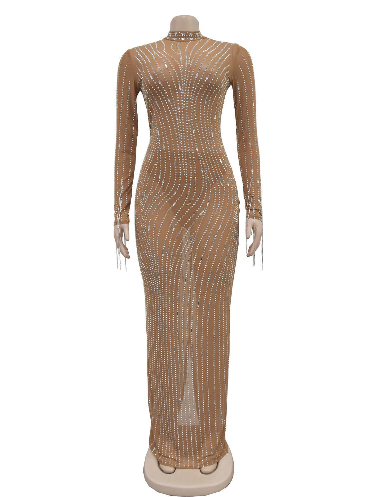 Elevate your inventory with this stunning rhinestone-embellished maxi dress featuring sheer long sleeves. The see-through design creates an elegant, layered aesthetic perfect for evening wear and special occasions. Intricate rhinestone detailing catches light beautifully, adding glamour and sophistication. The flowing maxi silhouette flatters all body types while the long sleeves provide versatile coverage. Ideal for wholesale buyers seeking statement pieces that command premium pricing. High-quality construction ensures durability through multiple seasons of wear and resale cycles.