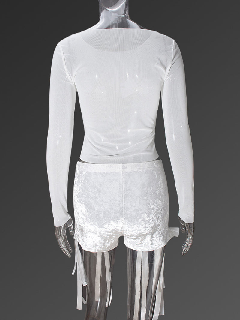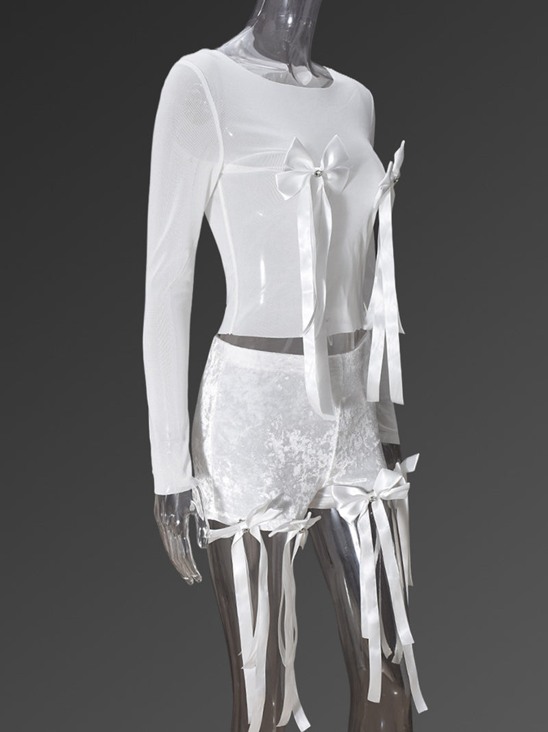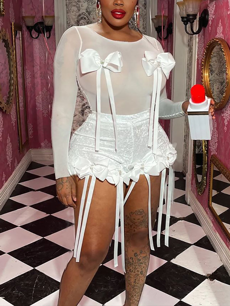 Elevate your inventory with this alluring two-piece set featuring delicate lace construction and playful bow accents. The sheer top pairs seamlessly with coordinating shorts, creating a versatile ensemble perfect for intimate apparel retailers. Crafted for comfort and style, this set appeals to customers seeking trendy, fashion-forward pieces. Ideal for wholesale distribution, offering excellent margins and strong market demand in the contemporary lingerie category.
