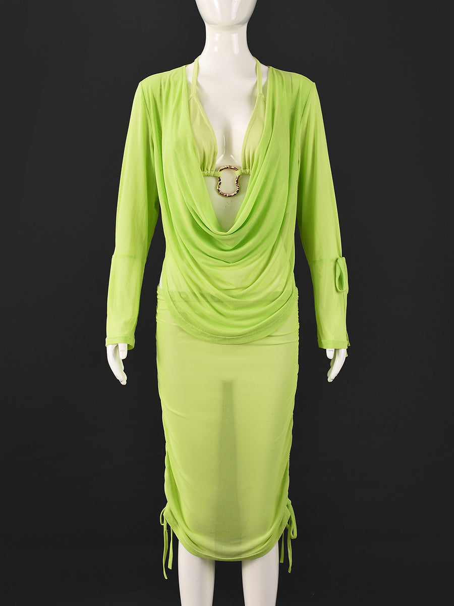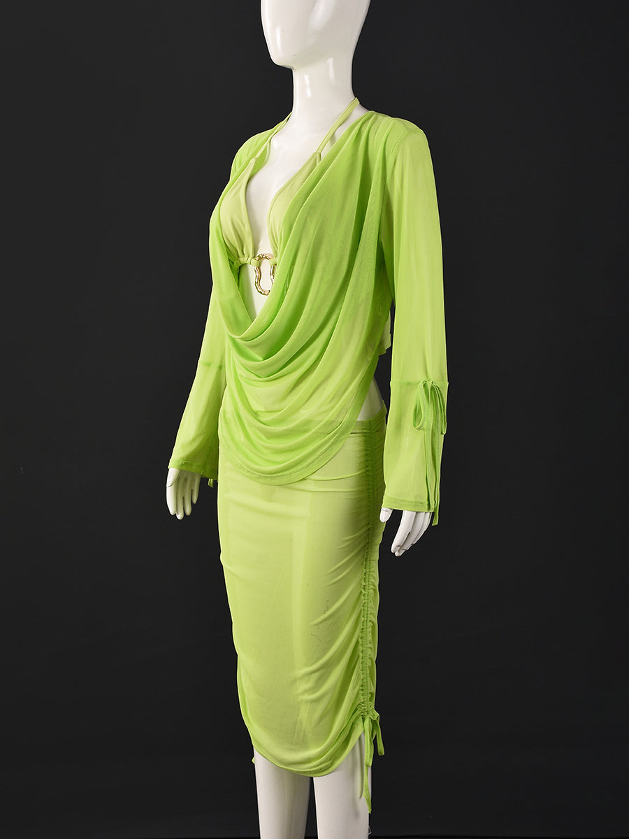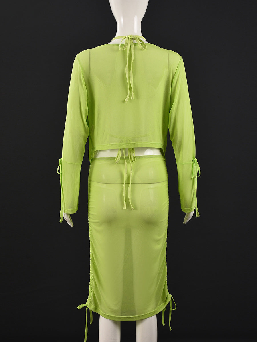 # Sexy Cropped Ruched Tops Mesh Sheer Skirt 3 Piece Set This versatile three-piece ensemble combines contemporary style with flattering silhouettes. The cropped top features strategic ruching for a sculpted fit, while the sheer mesh skirt adds an alluring dimension to your wardrobe. Perfect for wholesale buyers seeking trendy pieces with strong visual appeal, this set offers excellent value for resale. The coordinated design works as a complete outfit or separates, maximizing styling options for your customers. Quality construction ensures durability through repeated wear and washing, making it an ideal inventory choice for fashion-forward retailers.