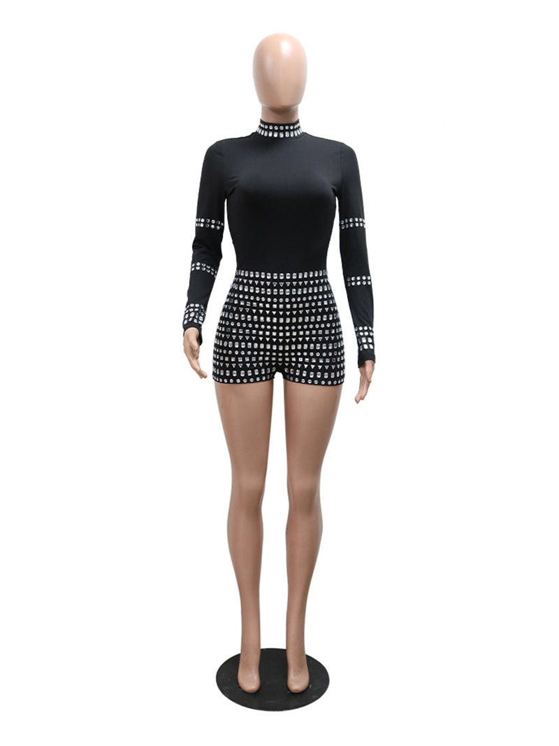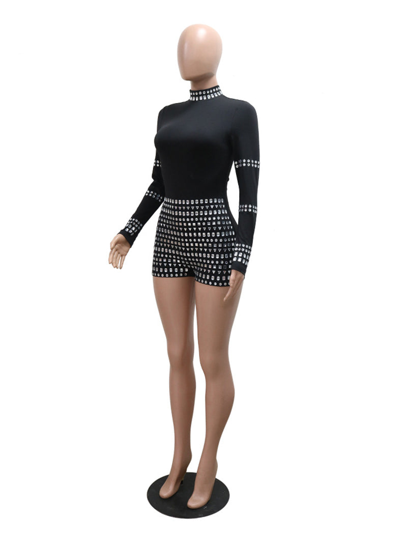 Make a statement at your next event in this eye-catching rhinestone patchwork romper. Featuring strategic rhinestone embellishments and a sleek skinny silhouette, this piece combines glamour with contemporary style. The patchwork design adds visual interest while maintaining a flattering fit. Perfect for nightclub outings, parties, and special occasions where you want to stand out. Crafted for confidence and comfort, this romper delivers the bold aesthetic your customers demand.