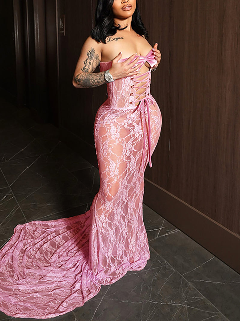 Sexy See-Through Lace Corset Strapless Maxi Dress