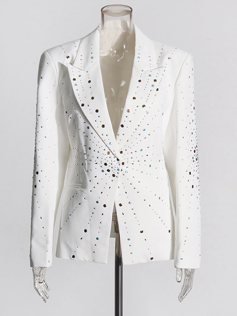 This stylish Sparkly Rhinestone White Peak Lapel Blazer is perfect for any fashionable wholesale shopper. Its high quality materials and intricate rhinestone detailing make it a must-have for your boutique. Elevate your inventory with this must-have piece and attract your customers with its elegant and eye-catching design.