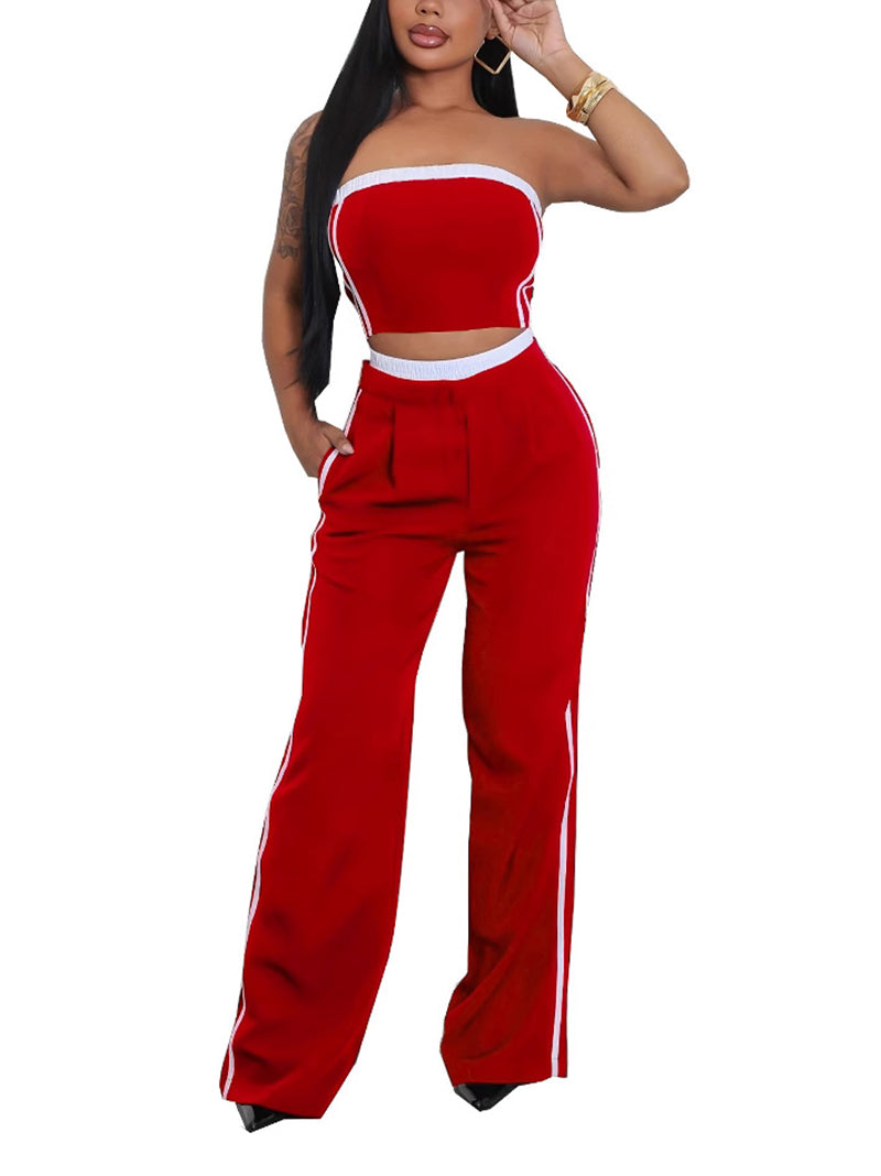 Introducing our Striped Sleeveless Strapless Crop Top And Pants Set. Perfect for wholesalers looking to add a trendy and stylish set to their inventory. Made with high quality materials and designed with a flattering fit, this set is sure to attract customers and boost sales. Make a statement with this must-have set today.