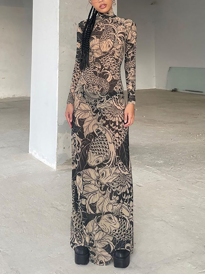 Looking for a stylish and profitable addition to your wholesale selection? Look no further than our Turtleneck Tattoo Print Maxi Bodycon Dress. With high profit margins and excellent value, this dress is sure to be a hit with your customers. Don't miss out on this must-have item.