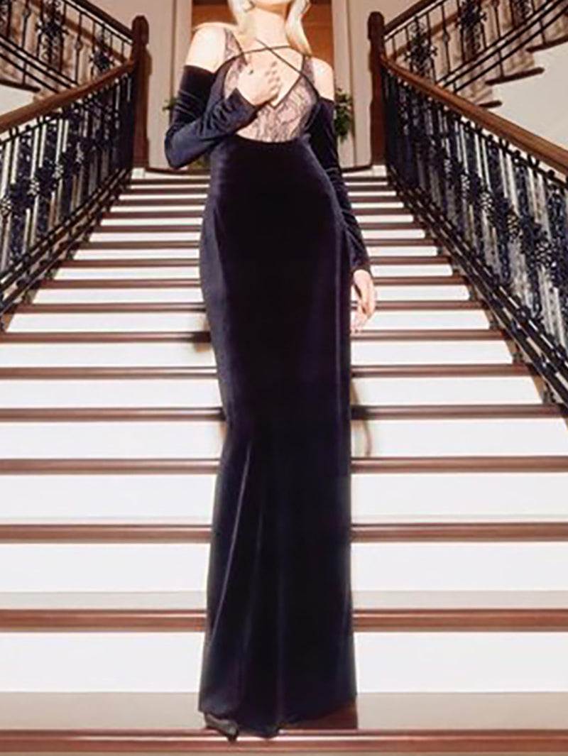 As a wholesaler, this V-neck lace velvet glove slim maxi dress is perfect for parties, graduations, and evening events. Embrace elegance and sophistication with its flattering fit and luxurious fabric. Make a statement with this timeless and versatile dress.