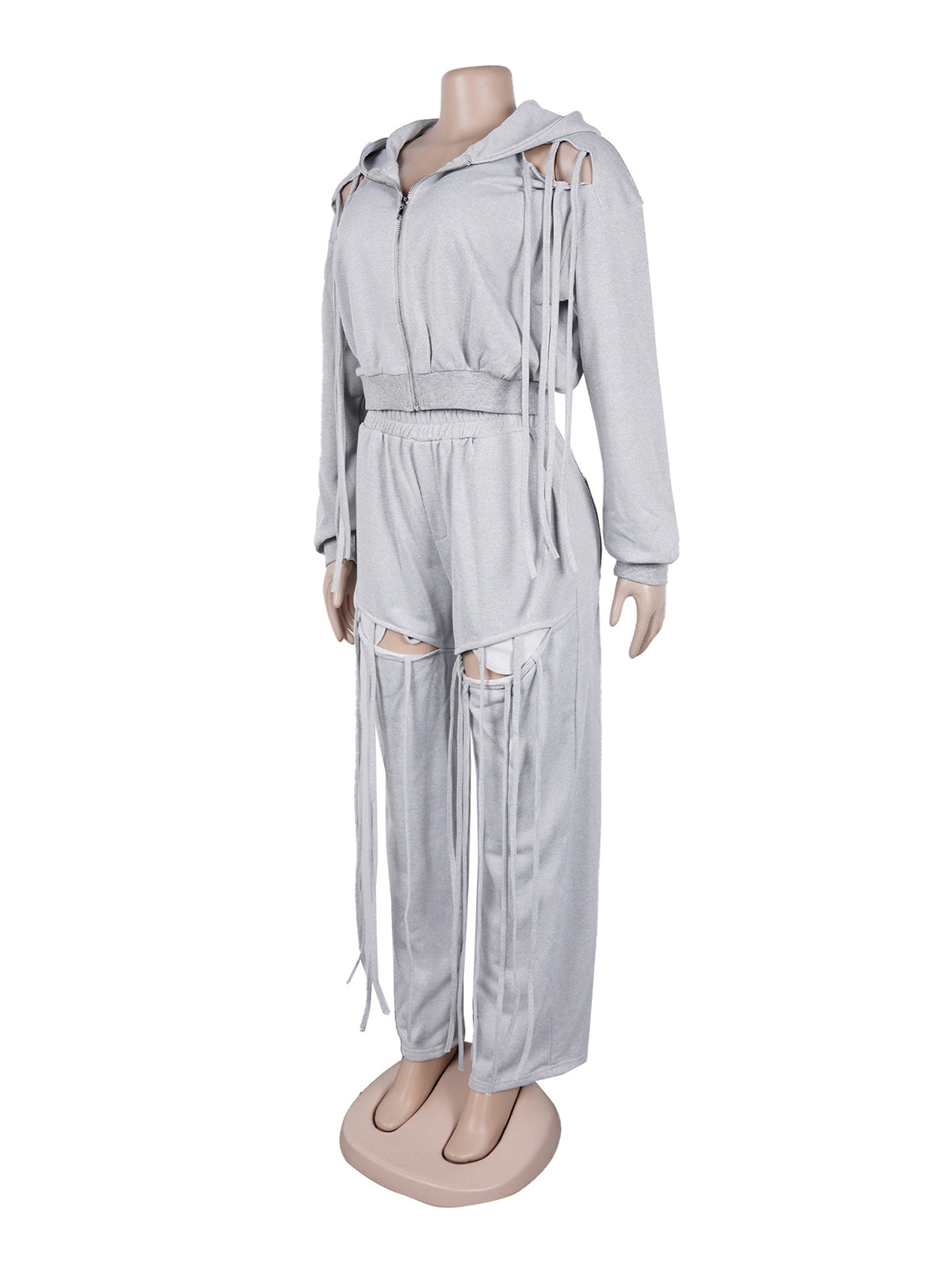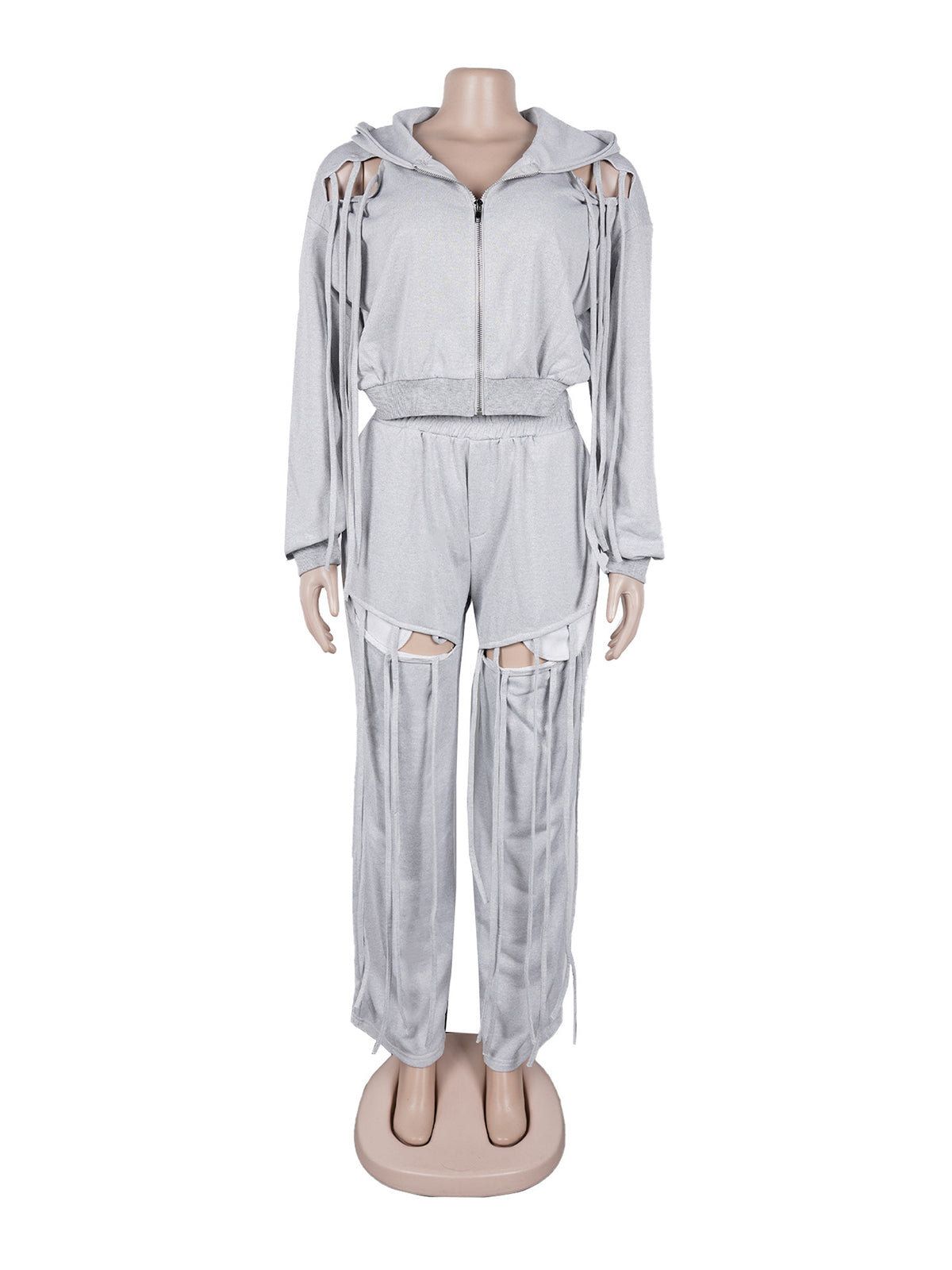 # Zipper Fringe Hoodie and Wide Leg Trousers Sets Elevate your wholesale inventory with this contemporary two-piece ensemble. The hoodie features a bold zipper front closure and eye-catching fringe detailing that adds movement and texture, while the coordinating wide-leg trousers deliver a relaxed, fashion-forward silhouette. Perfect for retailers targeting trend-conscious customers seeking comfortable yet stylish loungewear or casual wear. This set combines quality construction with modern design elements, making it an attractive offering for boutiques and online stores. Available for bulk orders with competitive wholesale pricing.