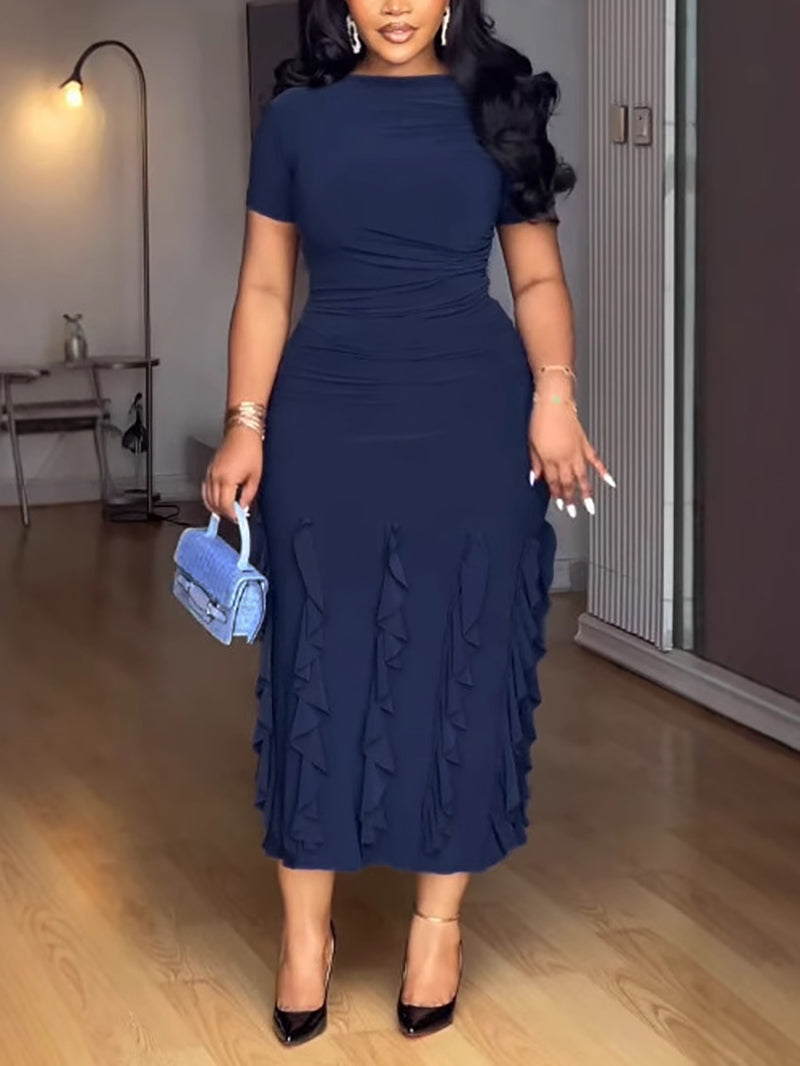 Casual Hem Layered Ruffle Bodycon Midi Dress offers a stylish yet comfortable fit, featuring layered ruffles that add a feminine touch. Its bodycon design accentuates the silhouette, while the midi length ensures versatility for various occasions. Ideal for retailers seeking trendy, easy-to-wear dresses that appeal to a wide customer base.