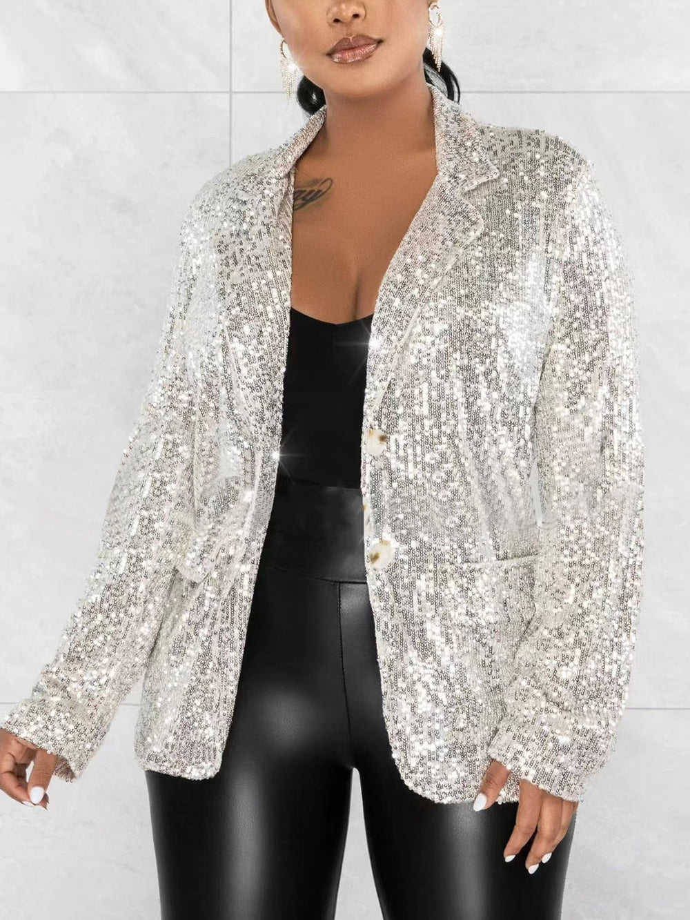 Explore your fashionista side with this ultra-chic Casual Sequin Suit Jacket. Featuring a sparkling sequin gold design,...