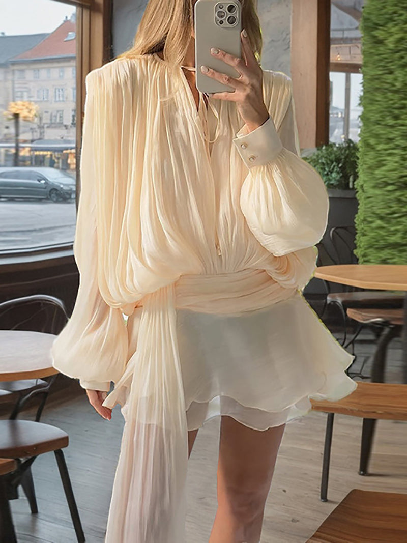 Fashion Mesh Puff Sleeve Pleated Ruffle Mini Dress