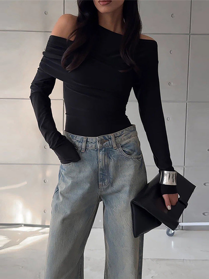 This off-shoulder T-Shirt features an irregular design and long sleeves, making it a unique and stylish addition to any wardrobe. Perfect for wholesalers looking to offer trendy and eye-catching clothing options to their customers.