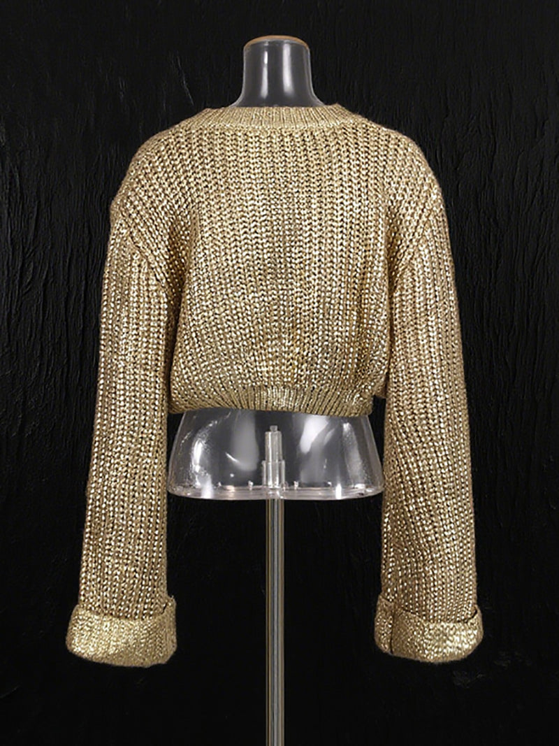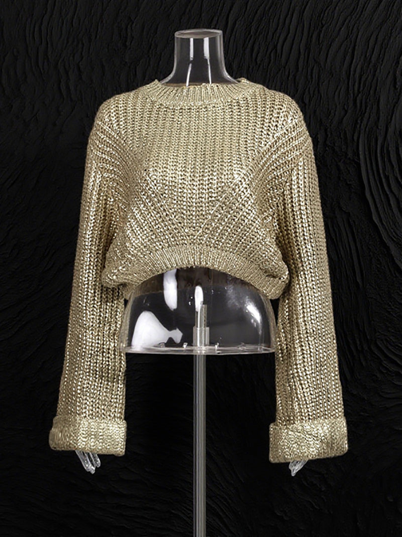 Fashion Round Neck Gold Foiled Knit Cropped Sweater Elevate your inventory with this contemporary cropped sweater featuring a classic round neckline and eye-catching gold foil detailing. Crafted from quality knit fabric, this piece delivers both style and comfort for modern consumers. The cropped silhouette pairs effortlessly with high-waisted bottoms, making it a versatile staple for any seasonal collection. Perfect for retailers seeking on-trend basics that appeal to fashion-forward customers. Available for wholesale orders.