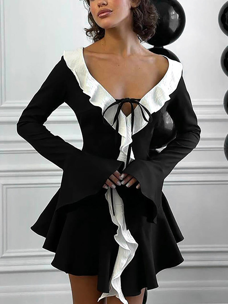 Wholesale fashion at its finest! This ruffle v-neck lace-up mini dress features a deep v-neck design that adds a touch of elegance and allure to any outfit. Perfect for any occasion, this dress will have you looking and feeling your best.