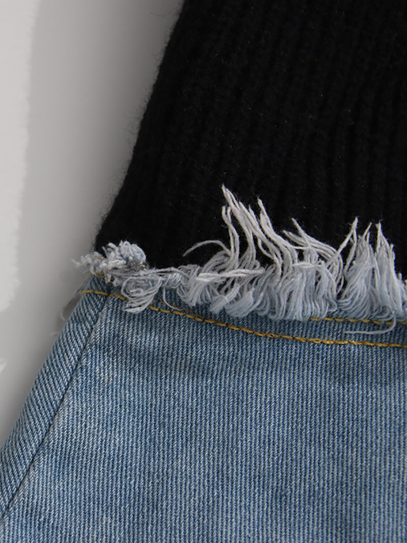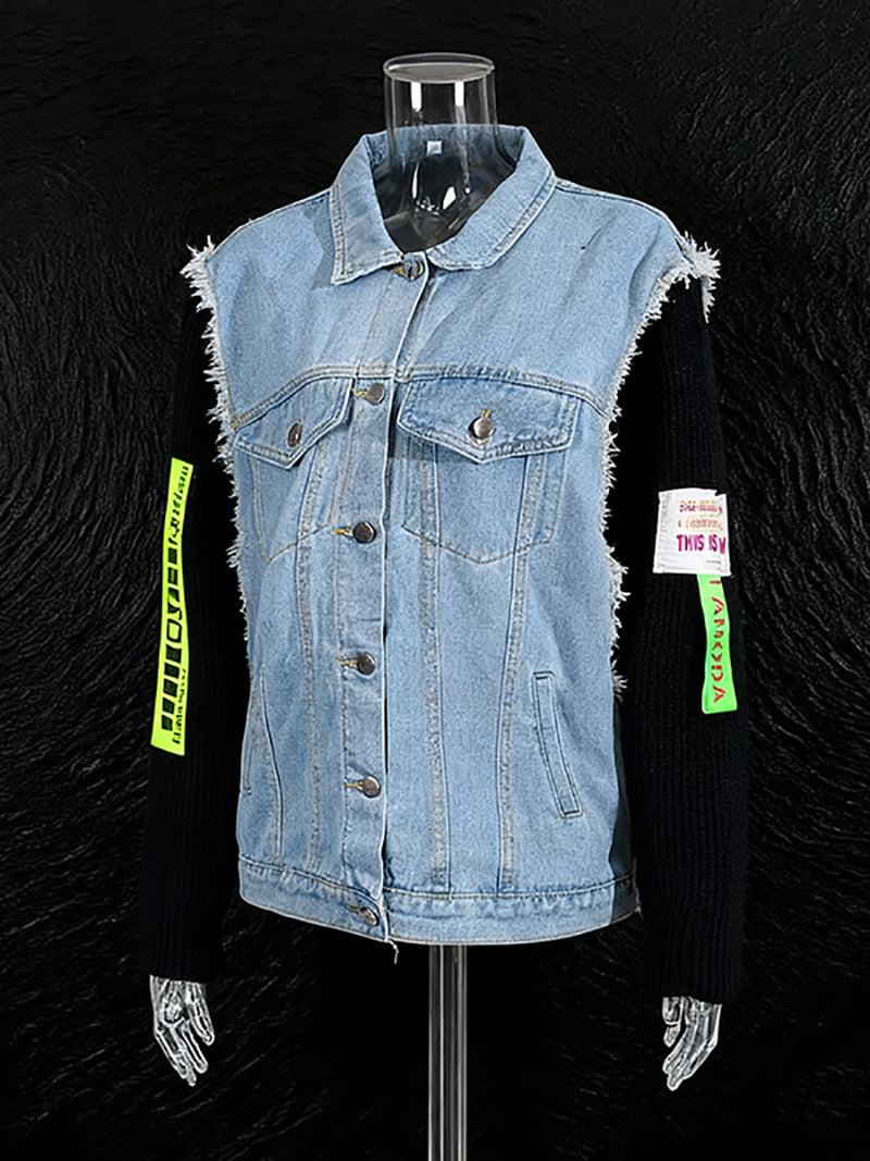 This knit long sleeve patchwork denim jacket features a single-breasted design, blending comfort and style. Its unique patchwork construction adds distinct character, making it a versatile outerwear choice. Ideal for wholesale buyers seeking trendy, high-quality denim jackets that offer both durability and a fashionable edge.