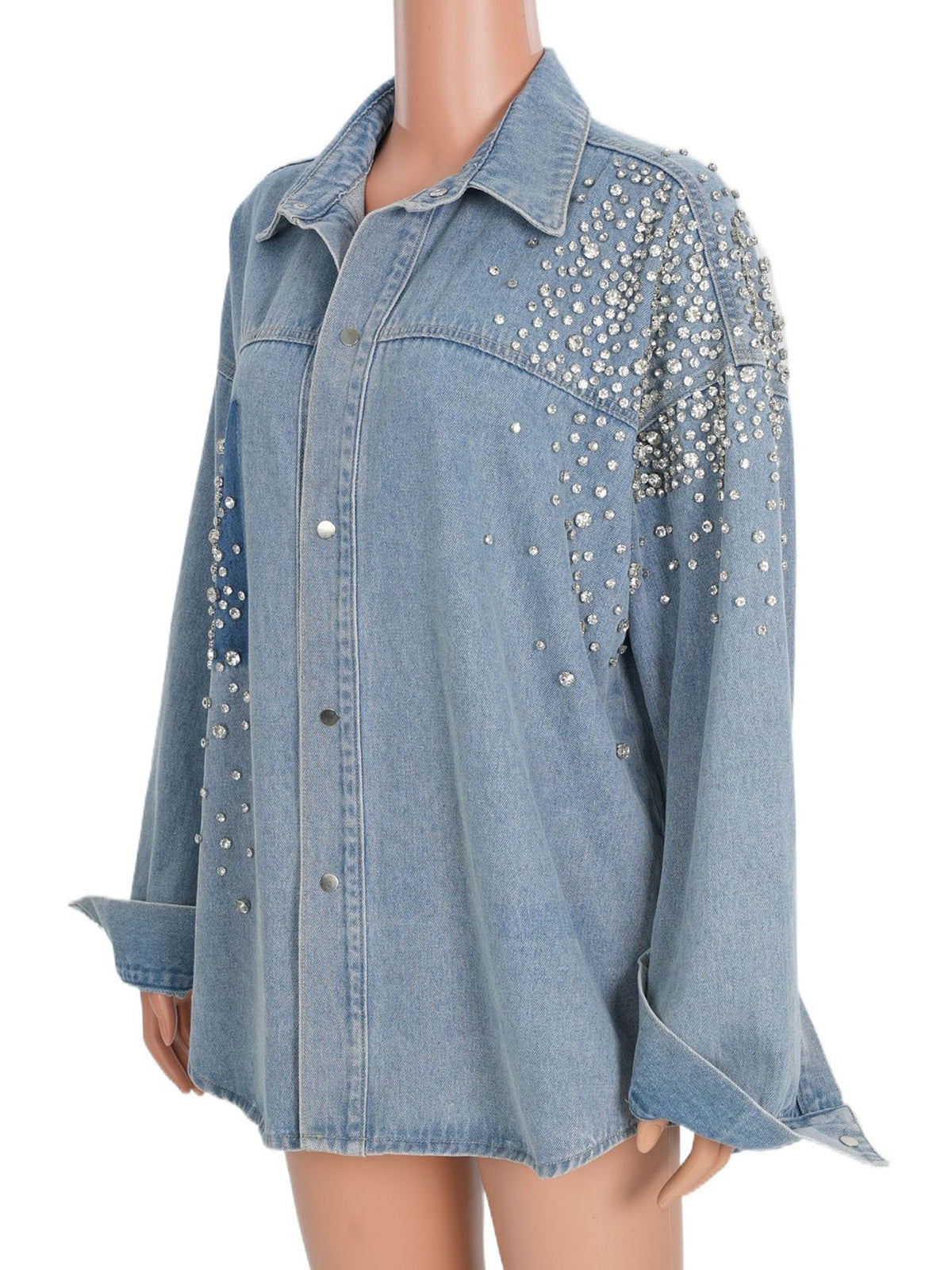 As a wholesaler, we bring you the perfect blend of style and affordability with our Rhinestone Loose Denim Shirt Jacket. The addition of large rhinestones adds a touch of elegance, all while giving you the best value for your money. Experience luxury without breaking the bank.