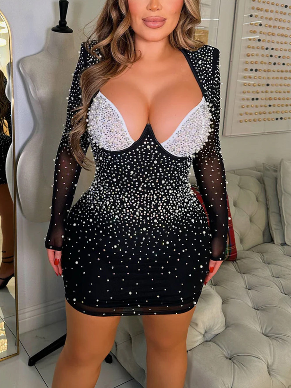 "Add a touch of glamour to your wardrobe with our Sexy Mesh Sheer Rhinestone Bodycon Dress. Its sheer material adds a seductive edge while the rhinestone detailing adds just the right amount of sparkle. Crafted with attention to detail and designed to hug your curves, this dress is perfect for a special occasion or a night out. Show off your confidence and style with this must-have piece."
