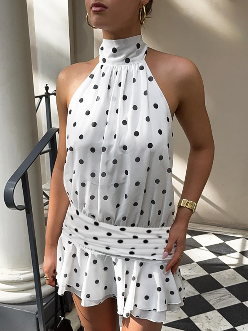 This Sexy Polka Dot Print Halter Lace-up Backless Mini Dress combines playful patterns with a daring design. Featuring a halter neckline and an adjustable lace-up back, it offers a flattering fit that enhances your silhouette. The mini length adds a flirty touch, making it perfect for events or nights out. Crafted to attract attention while providing comfort, this dress is ideal for retailers seeking stylish, on-trend apparel.