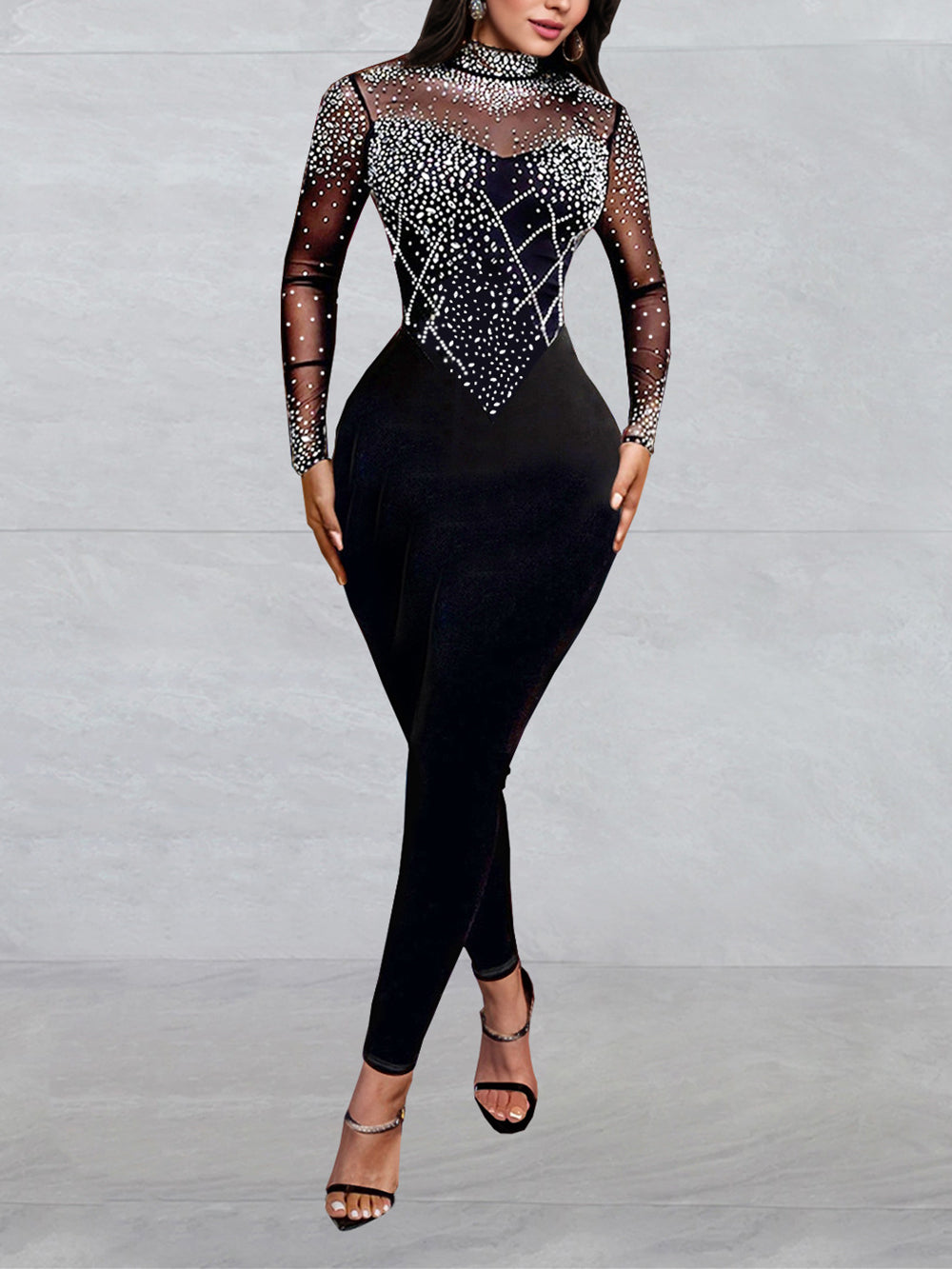 Introducing our must-have Sexy Rhinestones Sheer Bodycon Jumpsuits. Embellished with sparkling rhinestones, this jumpsuit is perfect for a night out. Its sheer fabric adds an alluring touch while the high-quality design offers unbeatable value. Upgrade your style game with this show-stopping piece.