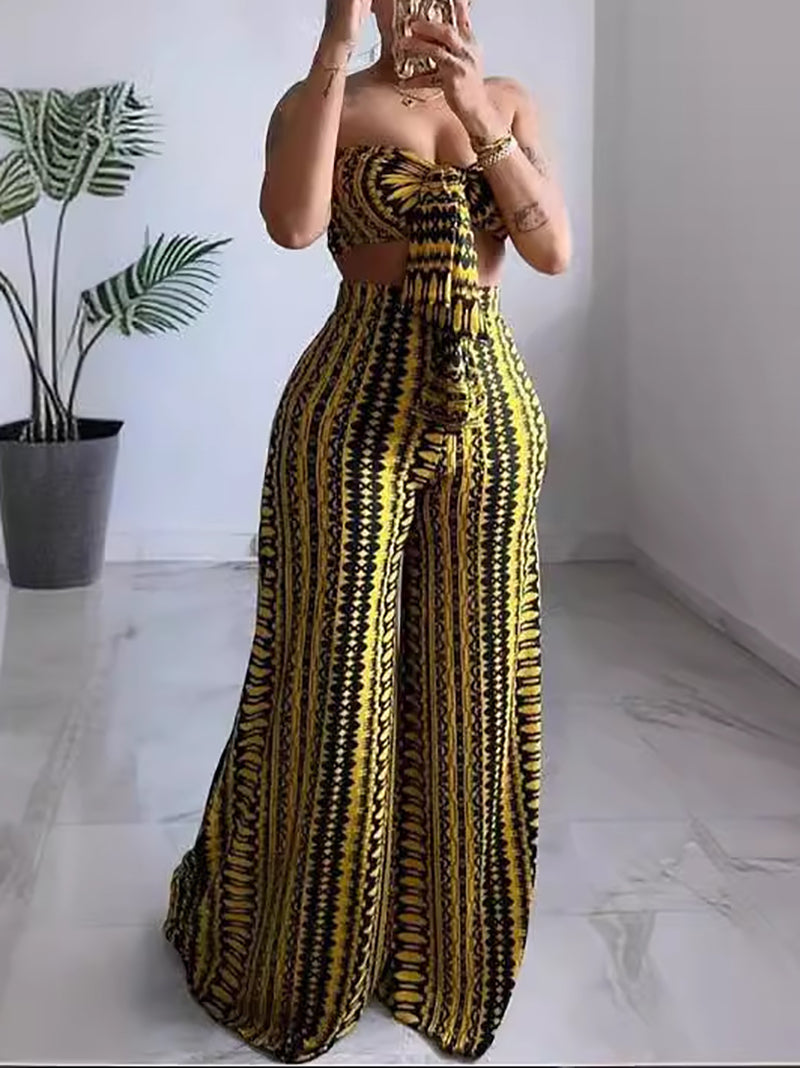 Wholesale this latest 2-piece set for your boutique and boost profits with its high demand and low returns. Don't miss out on this opportunity to stock up on trendy tie tube crop tops and wide leg pants sets.
